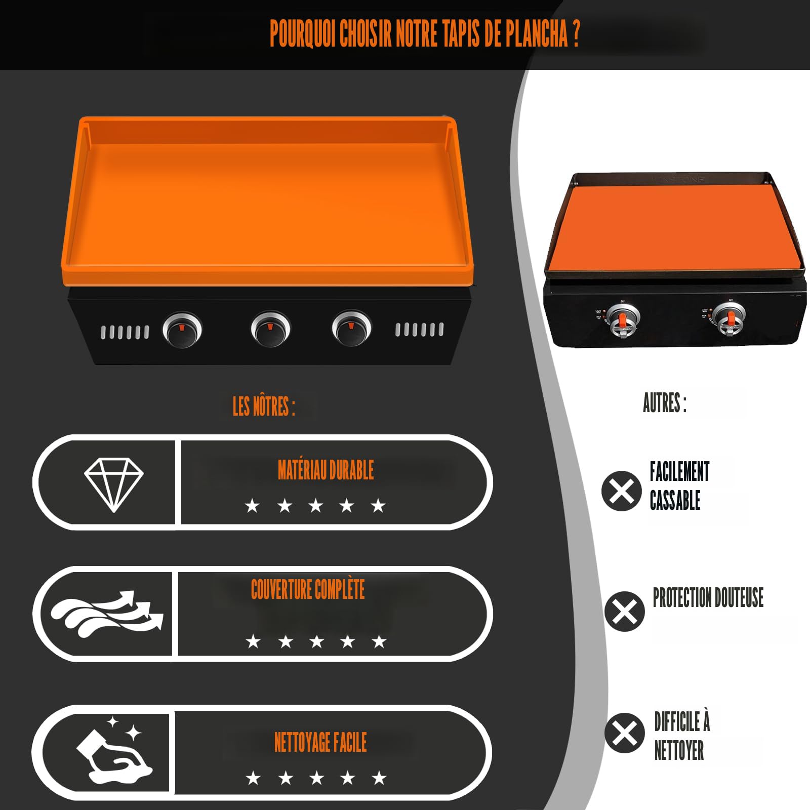 Nettoyer après un délicieux repas n'a jamais été aussi facile. Tapis De Cuisson De 91,4 Cm Pour Plaque Chauffante Blackstone Mais notre tapis de cuisson en silicone n'est pas seulement un protecteur, c'est un ami amical pour la planche. Housse De Tapis De Cuisson Pour Blackstone De 91,4 Cm Dites adieu aux débris indésirables et bonjour à un barbecue impeccable chaque fois que vous êtes prêt à cuisiner. Nous vous présentons notre assortiment parfait pour votre gril Blackstone de 91,4 cm – le tapis de cuisson de 91,4 cm conçu sur mesure Conçu pour fournir un ajustement parfait sans aucune coupe nécessaire, ce tapis de cuisson garantit zéro oscillation ou glissement, offrant une protection toute l'année pour votre surface de barbecue. Chaque centimètre de votre batterie de cuisine est entièrement protégé contre le pollen, les feuilles, et plus encore. Contrairement à d'autres tapis en silicone Blackstone qui laissent des espaces dans les coins, notre design innovant offre une couverture complète. Passez moins de temps sur des tâches de nettoyage fastidieuses et plus de temps à savourer des aliments sains et savoureux avec vos proches. Pas de coupe nécessaire, assurant un ajustement parfait à la surface de la plaque chauffante sans oscillation ou glissement. Prolongez la durée de vie de votre compagnon de cuisine bien-aimé en le gardant propre et bien rangé, même lorsqu'il n'est pas utilisé. Silicone de qualité alimentaire : le tapis de cuisson pour barbecue Blackstone est fabriqué en 100 % silicone de qualité alimentaire de haute qualité, épais, durable, doux, sûr et fiable, vous pouvez l'utiliser en toute confiance, il ne chauffera pas et ne transférera pas de chaleur, et peut résister jusqu'à 260 °C. Améliorez votre expérience culinaire aujourd'hui et profitez de la tranquillité d'esprit qui est livrée avec un tapis de cuisson parfaitement ajusté. Prolongez la durée de vie de votre wok en gardant la surface du barbecue propre et bien rangée lorsque le barbecue n'est pas utilisé. Fabriqué à partir de silicone de haute qualité de qualité alimentaire, ce tapis garantit des surfaces de cuisson sûres, permettant une préparation des repas... La housse de la plaque chauffante peut être nettoyée sans effort avec juste de l'eau et du savon ou jetée au lave-vaisselle pour plus de commodité. Ne vous contentez pas de moins quand il s'agit de maintenir la longévité de votre barbecue. 【Compatibilité parfaite】 : tapis de cuisson conçu sur mesure pour s'adapter à n'importe quel modèle de grille Blackstone de 91,4 cm. Facile à nettoyer : le tapis de cuisson en silicone peut être facilement et rapidement nettoyé avec juste de l'eau et du savon ou dans un lave-vaisselle, ce qui améliore votre expérience de cuisine.
