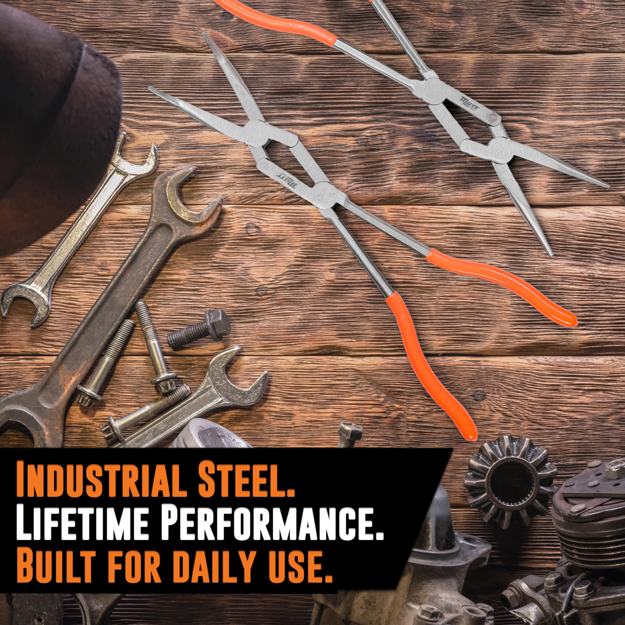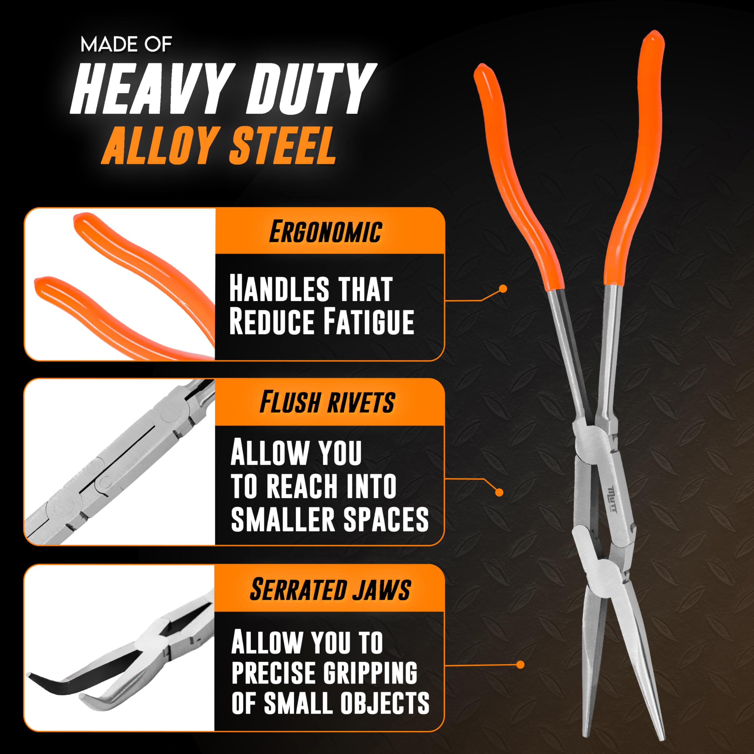 La pince à bec extra long vous garantit que vous pouvez saisir et manipuler dans les espaces contraints ; la pince longue à bec aiguille se couple avec une pince à bec aiguille longue portée pour une précision parfaite. Pince Extra Longue à Double Articulation Mutt Tools Lot De 2 Pinces Extra Longues De 33 Cm – Pince à Bec Aiguille Et Pince à Bec Coudé à 45° – Outils à Double Articulation Pour Les Espaces Pince à Double Articulation Profitez d'une prise en main fiable comme jamais auparavant. Nous vous présentons le lot de 2 pinces à double articulation que tout professionnel et amateur de bricolage devrait posséder Notre ensemble comprend une pince à bec aiguille à double articulation et une pince à bec coudé à 45 degrés. Commandez au meilleur prix et profitez de la livraison 24h ! Paiement en plusieurs fois sans frais Ce produit est fabriqué en Chine. Que vous soyez sur le marché des pinces extra longues, des pinces longues, des pinces à longue portée, des pinces à bec extra long ou des pinces à long manche, cet ensemble répond à toutes les exigences. Lot de 2 pinces à bec long et bec coudé à 45°, construction en acier au carbone, coupe précise, poignées ergonomiques antidérapantes, pour bricolage et travaux... Les mâchoires dentelées vous permettent d'obtenir une prise précise des petits objets. Avez-vous déjà eu du mal à atteindre un boulon dans un espace exigu ou besoin d'un outil pour saisir de petits objets ? Ces pinces sont là pour vous. Mutt Tools Lot de 2 pinces extra longues de 33 cm – Pince à Contrairement aux pinces ordinaires, elles sont livrées avec des rivets affleurants, ce qui signifie que vous pouvez maintenant atteindre des espaces encore plus petits sans aucune entrave. Mais pourquoi s'arrêter à une seule fonction ? Notre pince à bec aiguille à double articulation, également connue sous le nom de pince double x et pince double, offre une solution polyvalente 2 en 1., Considérez-les comme des pinces composées qui répondent à plusieurs besoins. Vous vous demanderez comment vous avez pu vous en passer. Prise en main et confort supérieurs : pince double avec mâchoires dentelées pour une prise en main précise et pince ergonomique à long manche pour réduire la fatigue de la main. Maîtrisez les points étroits : notre pince à double articulation se distingue par sa conception de pince extra longue, vous permettant d'atteindre plus loin et de travailler efficacement dans les zones étroites auxquelles les pinces standard ne peuvent tout simplement pas accéder.