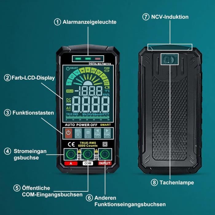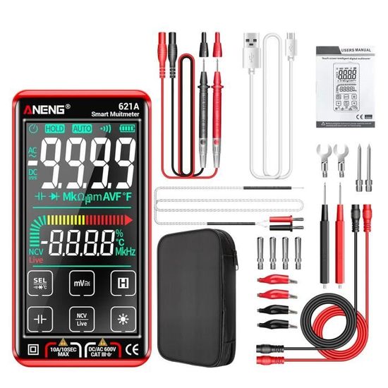 Description du produit Multimètre numérique A1X multimètre numérique intelligent multimètre numérique intelligent avec plage automatique Spécifications : Type d'élément : Multimètre numérique Matériau : ABS Affichage : Écran LCD Valeur d'affichage maximale : 1 999 chiffres Alimentation : batterie au lithium 3,7 V intégrée, 400 mAh. Avec rétroéclairage : les ampoules à l'arrière ont une luminosité élevée et l'éclairage simplifiera grandement votre travail et votre utilisation dans des environnements sombres. Multimètre-Gamme automatique A1X Multimètre rechargeable-A1X (Standard Test intelligent : le multimètre est capable de tester la tension AC et DC, la capacité, la résistance, la diode, etc., très pratique. Excellente protection : le bon boîtier ABS est isolé électriquement, ce qui fournira une protection complète contre les chutes et les fuites électriques Transport pratique : livré avec un poids léger et une taille compacte, le multimètre est très pratique à transporter à l'intérieur et à l'extérieur. Multimètre Numérique Ht127b Multifonction 6000 Compte Analogique Plage - Chine M Testeur Electrique Fonctionnement simple : le voltmètre grand écran, associé à la plage automatique et à l'affichage numérique à 1 999 points, est facile à utiliser et offre une grande précision. Excellente protection : le bon boîtier ABS est isolé électriquement, ce qui fournira une protection complète contre les chutes et les fuites électriques. Test intelligent : le multimètre est capable de tester la tension AC et DC, la capacité, la résistance, la diode, etc., , très pratique. Multimètre Intelligent (A6013L)Multimètre Numérique Haute Précision Capacimètre Intelligent Deco...