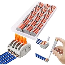 Insérez simplement les fils et abaissez le levier pour une connexion sécurisée, idéale pour les professionnels et les bricoleurs. Polyvalence et Compatibilité: Adaptés à divers diamètres de câbles, ces connecteurs supportent une large gamme d'applications électriques. Optimisez vos installations électriques avec notre kit de 10 connecteurs électriques à levier, une solution innovante et fiable pour vos projets de câblage Ils sont parfaits pour le câblage domestique, les installations de luminaires et les configurations complexes de bâtiments. La technologie de serrage par ressort intégrée ajuste automatiquement la pression en fonction de l'épaisseur du câble, garantissant ainsi un contact fiable et durable, indépendamment des compétences techniques de l'utilisateur. Haute Sécurité et Durabilité: Fabriqués en nylon ignifuge de haute qualité, nos connecteurs garantissent une excellente résistance à la corrosion, au vieillissement et aux hautes pressions. Chaque connecteur est fabriqué à partir de nylon ignifuge de première qualité, offrant une résistance exceptionnelle à la corrosion, au vieillissement, et aux hautes pressions. Design Innovant avec Points de Test Intégrés: Chaque connecteur est équipé d'un point de test intégré permettant des vérifications électriques rapides sans démontage. Parfait pour tous vos projets de câblage, ce kit est l'outil que vous attendiez pour simplifier votre travail tout en garantissant des résultats professionnels et durables. Levier-Écrou Fil Connecteurs, 11 Pièces CESFONJER Bornes de Connexion... Cette fonctionnalité unique facilite grandement la maintenance et les tests réguliers des installations. Connecteur Electrique 10PCS Connecteurs De Câble Électrique à Levier De 8 Ports, Connecteurs Wago 2 Entrées Investissez dans notre kit de connecteurs de câble à levier et bénéficiez d'une installation rapide, d'une sécurité accrue, et d'une efficacité inégalée. Le cœur de nos connecteurs, fait de cuivre de haute qualité avec un revêtement spécial anti-oxydation, assure une conductivité électrique optimale. Leur conception assure également une isolation parfaite et une protection contre les flammes pour une utilisation en toute sécurité. Leur conception intuitive permet une installation rapide et sans outil, simplement en insérant les câbles et en abaissant les leviers. 10 Pièces PCT-218 Levier-Écrou Fil Connecteurs, 8 Ports Conducteur Compact Fils Connecteurs Compact Connecteur Ressort Bornier 96605278