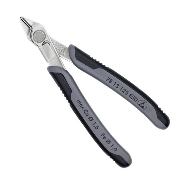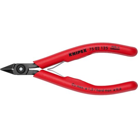 dans le domaine de l'électronique et de la mécanique de précision. Tranchants meulés avec grande précision, affûtés, dotés de très petits biseaux pour la coupe exacte de composants électroniques sensibles ; également disponibles sans biseau pour une coupe à ras. Tranchants de précision trempés par induction, dureté d'env., 64 HRC , Env. Pince coupante diagonale sans facette Knipex 79 42 125 Z 125 mm 1 pc(s) - Electronic France 79 02 125 ESD Pince coupante de côté de précision pour l’électronique ESDPinces de précision pour travaux de coupe très délicats, par ex. Largeur de tête (A): 11 mm, ESD: oui Nous commandons cet article pour vous directement chez le fabricant, car il ne fait pas partie de notre assortiment principal et n'est donc pas en stock... Également disponibles sans biseau pour une coupe à ras dans le domaine de l'électronique et de la mécanique de précision Capacités de coupe fil d'acier mi-dur (diamètre): Ø 1,3 mm 20 % plus légère que les pinces électroniques standard 79 32 125 ESD EAN 4003773061557 Pince brunie Tête polie Poignées avec gaines bi-matière Poids 61 g Dimensions 125 x 61 x 19 mm Norme DIN ISO 9654 DIN EN 61 340-5 conforme REACH ne contient pas de SVHC conforme RoHS non applicable Capacités de coupe fil d'acier mi-dur (diamètre) 1,1 mm Schneidwerte harter Draht (Durchmesser) 0,6 mm Capacités de coupe corde à piano (diamètre... Pince De Précision Electronique Knipex Pince Coupante Achetez Simplement Pince Coupante De Cu00f4tu00e9 De Pru00e9cision Pour L Esd Avec Gaines Bi Matière Brunie 125 Mm Pince Coupante Knipex Pince Coupante Precision 20 % plus légère que les pinces électroniques standard.