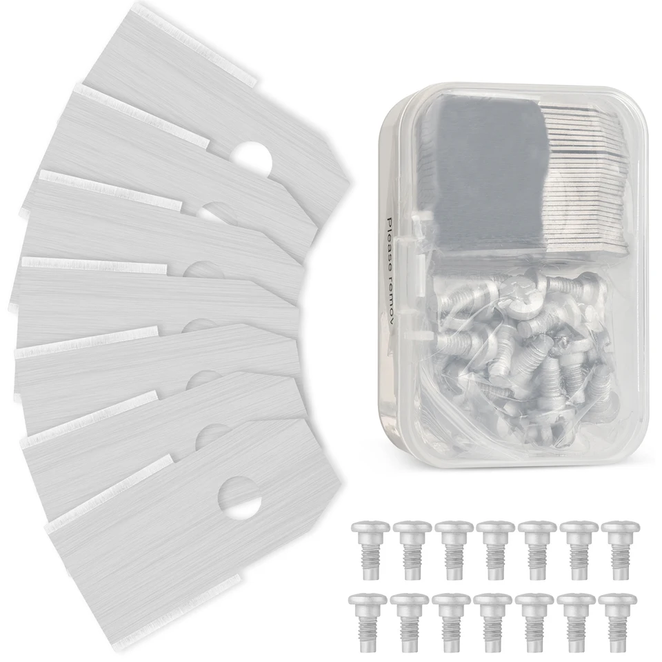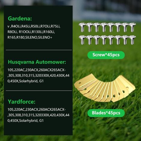 Compatible : grâce à une fabrication précise, nos lames de rechange revêtues de titane sont compatibles avec les robots à gazon sur les modèles courants des fabricants Husqvarna Automower, Gardena, Yardforce et Einhell, etc. Matériau : nos lames en acier inoxydable avec revêtement en carbure de titane s'adaptent précisément, sont incassables et permettent une excellente image de coupe Qualité : pour fixer les lames, nous fournissons des vis galvanisées. Après le choix de la tondeuse à gazon, vient le choix du système de coupe et donc de la qualité de la lame de la tondeuse. Néanmoins, les soucis techniques et pannes peuvent survenir, notamment avec d'autres éléments tels quele lanceur de tondeuse pouvant se bloquer. En cas de panne liée à la lame de la tondeuse ou au support de lame, voici quelque... Voir la liste complète sur Afin de remplacer ou bien affûter la lame d’une tondeuse, il est absolument nécessaire de la démonter. Cela n’est pas très compliqué, commencer par vider le bac à herbe. Puis une fois la tondeusecouchée sur le côté, ou soulevée au moyen d’un cric, localiser la vis de la lame et le détacher à l’aide d'une clé. Voir la liste complète sur Le type de lame (lame de marque,lame universelle...) dont vous avez besoin pour votre tondeuse dépend du type de tondeuse, électrique, thermique, tracteur tondeuse, etc. mais aussi de l'usage que vous souhaitez en faire comme nous l'avons évoqué plus haut. Il existe différents types de lame et pour vous aider à bien choisir, nous vous en disons plu... Voir la liste complète sur Lames de rechange de haute qualité, 90 pièces, pour tondeuses à gazon... Lame Robot Tondeuse Husqvarna Couteaux Robot Tondeuse Lot 30 Lames Robot Tondeuse - Compatible Husqvarna, Gardena, Yard Force - Acier Inox Avec Vis Galvanisées Couteaux Rechange Tondeuse Robot Lame Pour Tondeuse Husqvarna 30 lames de rechange en alliage de titane, adaptées à toutes les