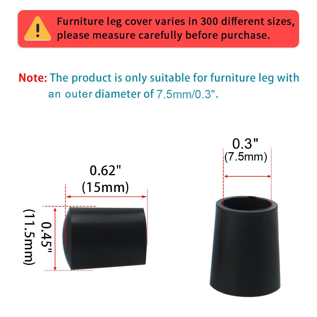 Veuillez vérifier la taille de vos pieds de chaise (diamètre) avant d'acheter. Convient aux pieds de chaise ronds : 7,5 mm de diamètre. Protégez votre bois dur, carrelage, sols stratifiés, plus de rayures. Faites glisser la chaise silencieusement et en douceur. Pas besoin de coller, simple à enrouler et ne tombe pas facilement. Nom du produit sourcing map 7,5mm ID Pied de Meuble Caoutchouc Rond Embout Coussin Capuchon Protection Chaise Table Meubles Noir 12Pcs Nom produit : pied de meuble Bon choix pour protéger vos meubles et votre sol. Caractéristiques : Protégez votre bois dur, carrelage, sols stratifiés, plus de rayures. Pas besoin de coller, simple à enrouler et ne tombe pas facilement. Convient pour la taille de montage : 7,5mm/0,29 (diamètre) Faites glisser la chaise silencieusement et en douceur. Poids net : 14g ; Contenu de l'emballage : 12 x pied de meuble Pieds De Table Caoutchouc Extérieur SOURCING MAP Pied De Meuble En Caoutchouc Coussin De Jambe Avec Pied De Table En Caoutchouc Qté: 16 Embouts en Caoutchouc - Pour Pieds des Tables, Chaises, Meubles - Différentes Couleurs et Tailles Disponibles (12mm, Noir) - par Lifeswonderful Pieds en... Pied de meuble SOURCING MAP Embout Pied Chaise 12mm ID Patin Tampon Protecteurs Jambe Meuble Anti-dérapant Caoutchouc Noir 32Pcs - Bricolage