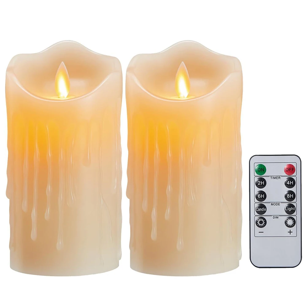 Yeelida Informations sur les bougies sans flamme étanches : Contenu : 2 bougies LED étanches, 1 manuel (français non garanti), 1 télécommande. Matériau : plastique épais. Couleur de la mèche : lumière chaude. Lot de 2 grandes bougies piliers étanches à LED sans flamme Lot de 2 bougies piliers étanches sans flamme vacillantes avec télécommande, LED à piles, minuteur en plastique blanc, 10,2 x 35,6 cm pour une utilisation... SoulBay Lot De 2 Bougies Sans Flamme à LED Vacillantes à Piles Avec Minuteur à Distance Caractéristiques spéciales : étanchéité IP55, extérieur, sans flamme, télécommande, scintillement, minuterie de cycle, augmentation/diminution de la luminosité.