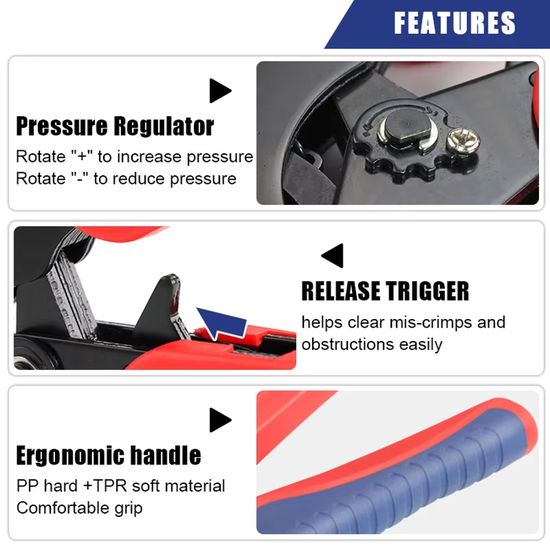 Style de sertissage spécial à quatre mandrins pour sertissage carré. La norme de sertissage de haute qualité garantit une action de sertissage répétable. Verrouillage de sécurité à dégagement rapide. Style de sertissage spécial à quatre mandrins pour sertissage carré. La norme de sertissage de haute qualité garantit une action de sertissage répétable La pince à sertir en acier au carbone de sertit de manière fiable et uniforme des cosses d'une taille allant de 0,08-16mm²/AWG 28-5. - La... Pinces à Sertir Bizline Pince A Sertir Cosses Isolees 0.5-6mm2 | Outillage ADC | Le Froid Pecomark Pince De Serissage Rs Aweohtle Pince à sertir 2 en 1 avec 2 têtes de rechange, Pince
