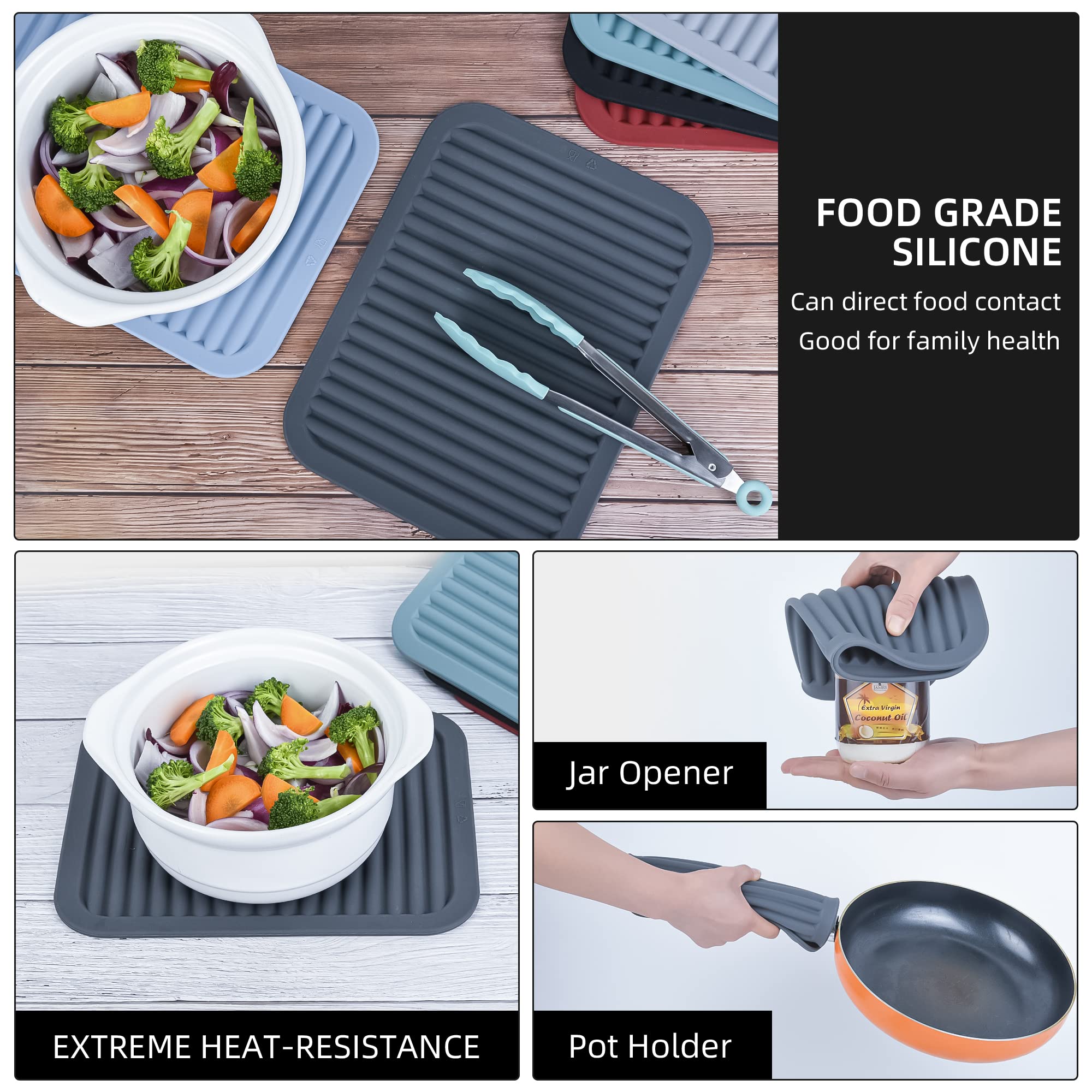 Dessous de plat en silicone parfait. Multifonction : ces dessous de plat en silicone au moins 8 usages sont polyvalents comme dessous de plat en silicone, dessous de plat pour casseroles et poêles chaudes, dessous de plat en silicone pour plats chauds, maniques chaudes, tapis de bol, gants chauds, repose-cuillère, tapis de séchage à vaisselle. Dimensions du dessous de plat : Tapis carré : 18 x 18 cm. Remarques : Les coussinets chauffants en silicone ne les chauffent pas directement au feu et ne les rayent pas avec des objets tranchants. Service : garantie de remplacement sans tracas. Couleur : noir, gris foncé, gris, bleu, couleur. En forme de triangle oblong (24x14x0,9cm), il est parfait pour les grandes plats et poêles. Le silicone résiste à des températures jusqu'à 250°C, donc vous... Lot de dessous de plat en silicone : Nos dessous de plat en silicone sont fabriqués à partir de silicone alimentaire 100 % sans BPA Nos dessous de plat en silicone sont protégés contre la chaleur et isolés comme protection pour comptoir, table, cuisinière ou autres. Dessous de plat en silicone : Gardez vos mains en sécurité lorsque vous manipulez des casseroles, plats et casseroles chaudes du four ou de la cuisinière. ADS, CUILLETTE Support, tapis de séchage, ouvre-bocal Dessous de plat : Accessoires pratiques et élégants Facile à nettoyer : les dessous de plat en silicone se rincent directement avec de l'eau ou passent au lave-vaisselle, faciles et sans tracas Lot De 6 Dessous De Plat En Silicone De Couleur Mélangée Pour Plats ce qui en fait un cadeau attentionné pour Noël, le Nouvel An, les anniversaires, la fête des mères, la fête des pères, une pendaison de crémaillère, etc. Dessous de plat en silicone souple et durable, résistant à la chaleur, recyclable, vert, contact direct avec les aliments, sécurité alimentaire, non seulement de haute qualité, mais également plus économique Facile à nettoyer : lavable au lave-vaisselle, imperméable, chaque tapis a un trou pour l'accrocher facilement. YOSOO dessous de plat pour casseroles chaudes Dessous de plat pliable antidérapant, Design... restent intacts dans des plages de températures extrêmes de -40 °C à 230 °C et peuvent être utilisés dans un four, congélateur, micro-ondes ou lave-vaisselle.
