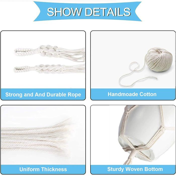 Fil de coton de haute qualité : notre corde en coton est fabriquée en lignes de coton naturel pur avec une couleur naturelle de haute qualité, sans pigments artificiels, respectueuse de l'environnement, sans danger, sans odeur particulière. Le fil de coton est solide et durable, résistant à la traction, à l'abrasion et à la lumière. Le cordon de macramé est très doux et ne se casse pas facilement. Les travaux manuels en cordon de coton sont robustes et durables. Cordon à macramé composé... Le fil de coton se compose d'un certain nombre de brins de dentelle fine et peut être utilisé pour le tricot à la main. Matière : coton naturel., Couleur : beige. Il peut également être divisé en plusieurs brins selon l'épaisseur et utilisé plusieurs fois. Artisanat, décoration de la maison, fabrication de jouets d'animaux et ainsi de suite. Cordon en coton doux pour jardin, macramé, suspension de Doux et durable : notre fil de coton en dentelle est fabriqué en plusieurs fils, plus épais et plus résistant que la ficelle traditionnelle. Le fil de coton est agréable au toucher, doux et durable, idéal pour les travaux d'aiguille, etc. Nous vous remercions de votre compréhension Corde Jute 10mm Cordon En Coton Doux Pour Jardin, Macramé, Suspension De Plantes, 10 Mm D'épaisseur, Beige (15 M Leroy Merlin Corde De Jardin D'un diamètre de 10 mm et d'une longueur de 15 mètres, en coton naturel beige, elle est parfaite pour réaliser des tentures murales, des pots de fleurs... Le fil de coton est solide et durable, avec une forte résistance à la traction, une haute friction, une forte absorption d'eau et une forte puissance de couleur. Si vous avez des questions sur nos produits lors de l'achat et de l'utilisation, veuillez nous contacter et nous vous donnerons une réponse satisfaisante dans les 24 heures.