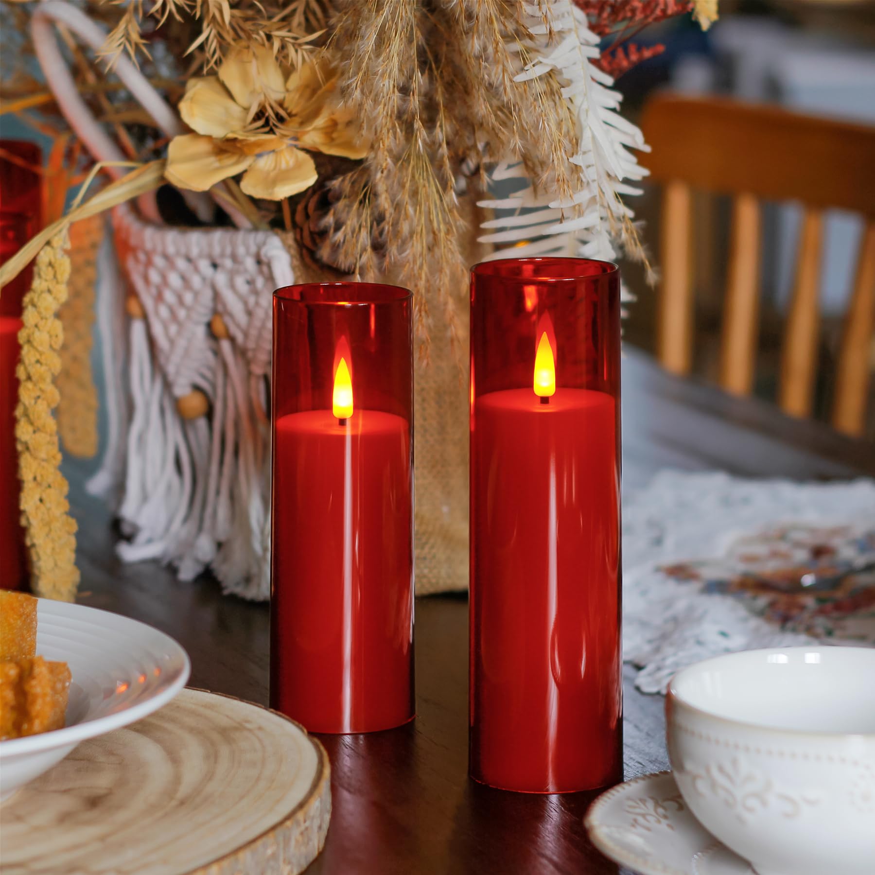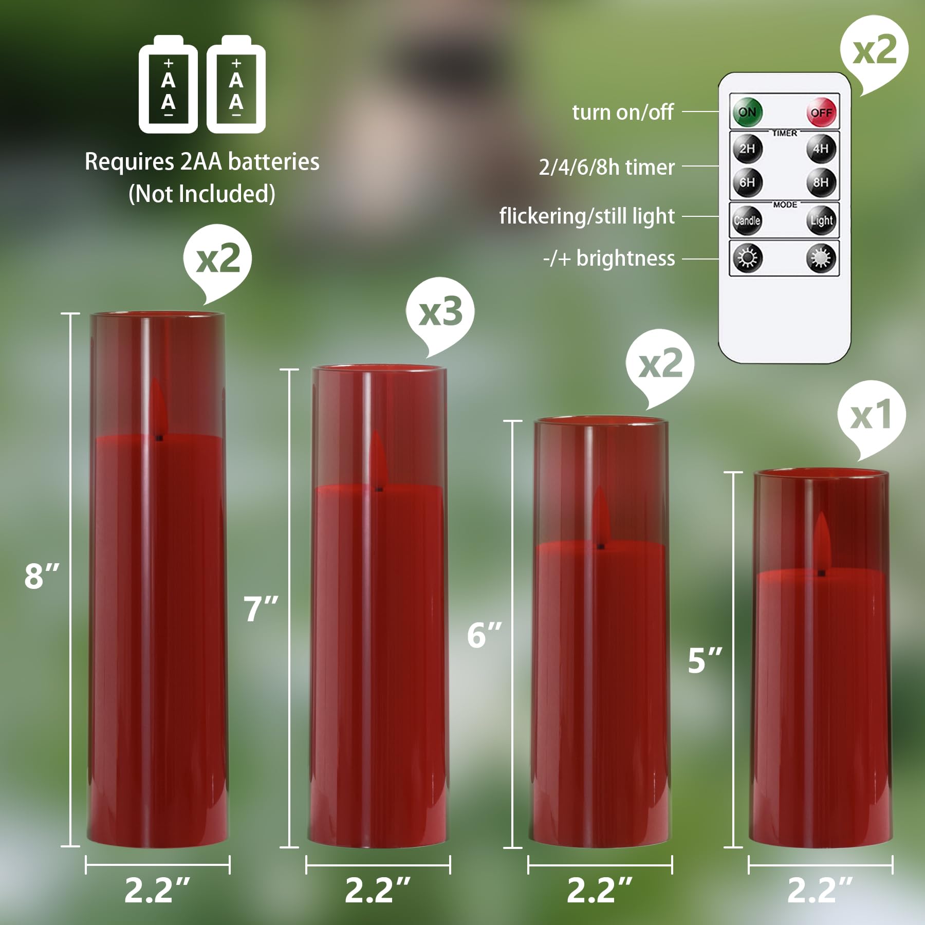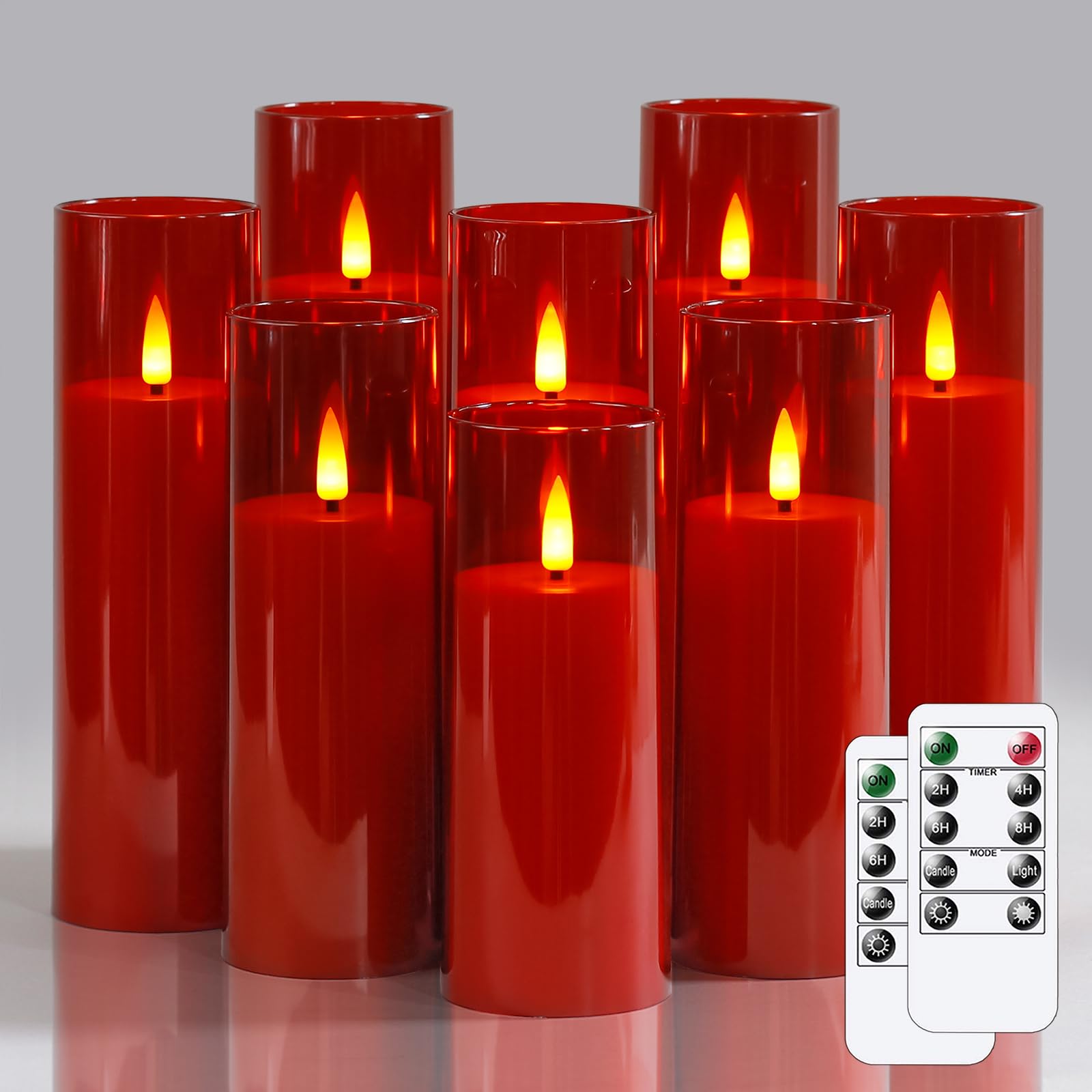 Set complet avec 8 Bougies LED : Cet ensemble comprend 8 bougies LED, 2 télécommandes et 1 manuel d'utilisation. Zevanor Bougies sans flamme avec scintillement 5,5 cm x 12,5 cm, 15 cm, 17,5 cm, 20 cm, 20 cm, Bougies à piles LED en plastique rouge avec minuterie (Autonomie 600 heures, Pack de 5 Profitez d'une ambiance prolongée sans entretien constant Bougie Telecommande Lot De 8 Bougies LED Sans Flamme Alimentées Par Piles 5,5cm Bougie A Pile Minuterie automatique pour une utilisation facile : Les options de minuterie réglables (2, 4, 6 ou 8 heures) permettent aux bougies fonctionnant sur piles de s'allumer et de s'éteindre à la même heure chaque jour. Longue durée avec fonction minuterie : Avec une autonomie de 800 heures sur 2 piles AA (non incluses), ces bougies LED étanches offrent une utilisation prolongée. Programmez des minuteries de 2, 4, 6 ou 8 heures pour un allumage quotidien à la même heure Aspect réaliste et luminosité réglable : Fabriquées en plastique épaissi avec un effet de flamme vacillante, ces bougies LED offrent une lueur chaleureuse et réaliste. 2 télécommandes incluses : Utilisez facilement vos bougies LED avec les 2 télécommandes incluses. Les 2 télécommandes permettent un réglage facile dans un rayon de 8 mètres, ce qui augmente la commodité et la flexibilité