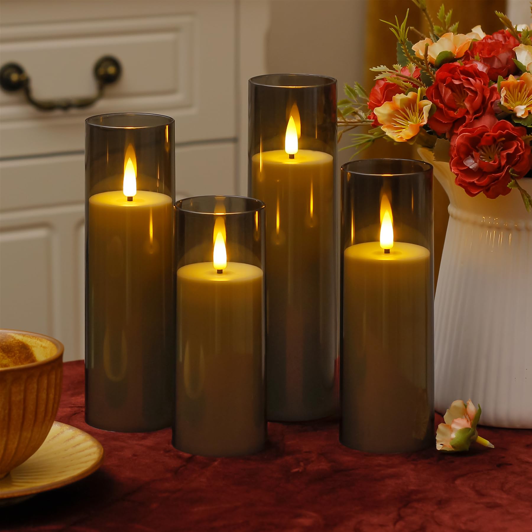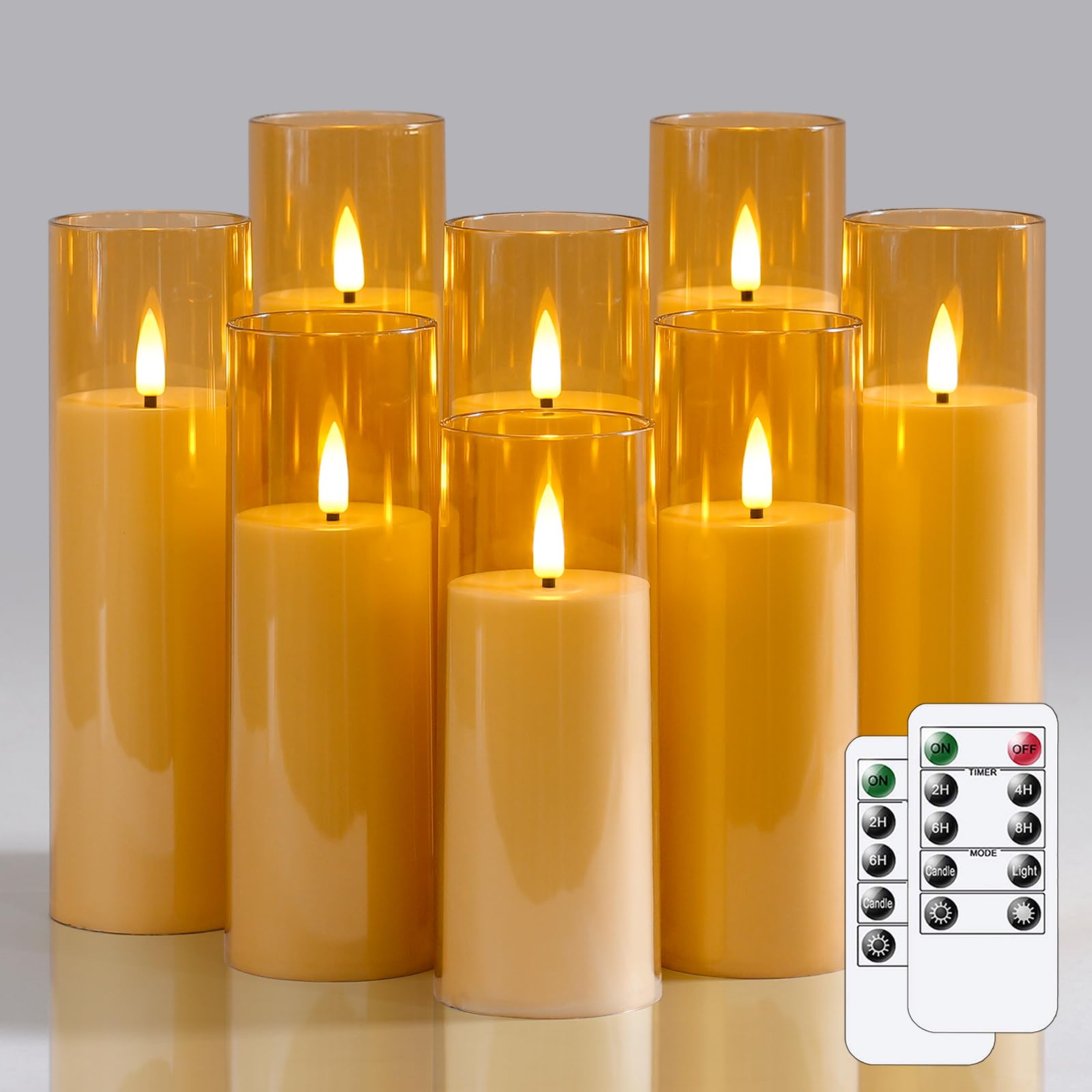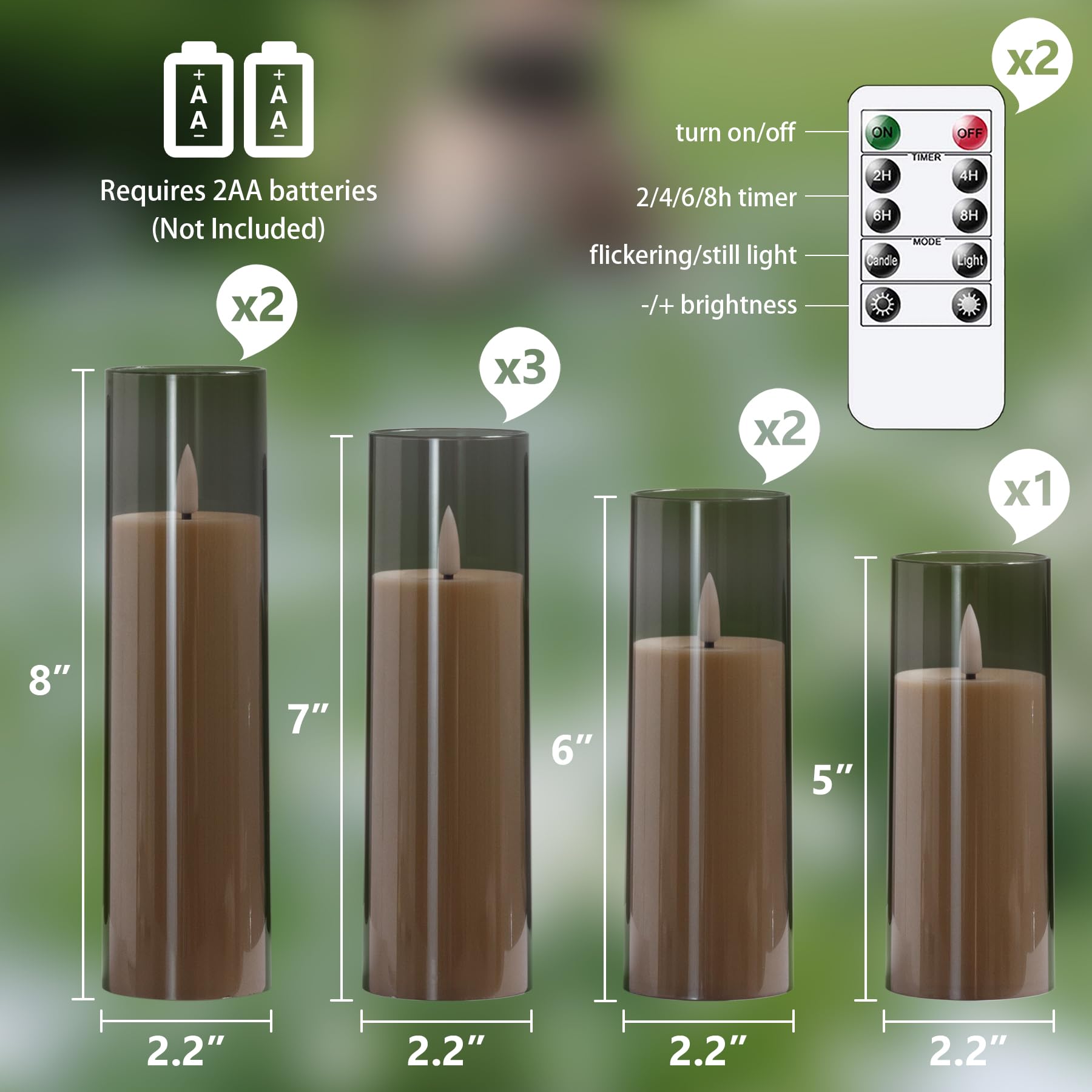 Set complet avec 8 Bougies LED : Cet ensemble comprend 8 bougies LED, 2 télécommandes et 1 manuel d'utilisation. Zevanor Bougies sans flamme avec scintillement 5,5 cm x 12,5 cm, 15 cm, 17,5 cm, 20 cm, 20 cm, Bougies à piles LED en plastique rouge avec minuterie (Autonomie 600 heures, Pack de 5 Profitez d'une ambiance prolongée sans entretien constant Bougie Telecommande Lot De 8 Bougies LED Sans Flamme Alimentées Par Piles 5,5cm Bougie A Pile Minuterie automatique pour une utilisation facile : Les options de minuterie réglables (2, 4, 6 ou 8 heures) permettent aux bougies fonctionnant sur piles de s'allumer et de s'éteindre à la même heure chaque jour. Longue durée avec fonction minuterie : Avec une autonomie de 800 heures sur 2 piles AA (non incluses), ces bougies LED étanches offrent une utilisation prolongée. Programmez des minuteries de 2, 4, 6 ou 8 heures pour un allumage quotidien à la même heure Aspect réaliste et luminosité réglable : Fabriquées en plastique épaissi avec un effet de flamme vacillante, ces bougies LED offrent une lueur chaleureuse et réaliste. 2 télécommandes incluses : Utilisez facilement vos bougies LED avec les 2 télécommandes incluses. Les 2 télécommandes permettent un réglage facile dans un rayon de 8 mètres, ce qui augmente la commodité et la flexibilité
