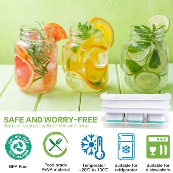 Silicone souple et démoulage facile : contrairement aux plateaux en plastique rigide, nos moules flexibles en silicone de qualité alimentaire permettent de retirer la glace sans effort : il suffit de pousser ou de tourner la base pour un démoulage instantané Respectueux de l'environnement et durable, ils sont conçus pour une utilisation zéro déchet et résistent aux odeurs du congélateur. Mais si vous rencontrez des problèmes, envoyez-nous simplement un message, nous nous engageons à y remédier. Votre satisfaction est notre priorité, et nous allons au-delà des attentes pour nous assurer que vous êtes satisfait à la fois du produit et de notre service. Lot De 2 Bacs À Glaçons En Silicone (Sans Bpa), Grand Bac À Glaçons Nous sommes convaincus que vous allez adorer notre moule à glaçons en silicone de qualité supérieure. Moule Glacon Silicone Moule à Glaçons Carré En Silicone De Type Presse Avec Couvercle, Boîte Souper Cubes L'entonnoir inclus vous permet de remplir les moules proprement, pas de déversement, juste des résultats cristallins Passe au lave-vaisselle et aux taches pour une réutilisation sans tracas. Aucune recharge nécessaire, il suffit de congeler et de servir Lot de 3 bacs à glaçons carrés sphériques en silicone – Moule de grande taille avec couvercle amovible étanche – Bac à glaçons carré et gratuit pour les...