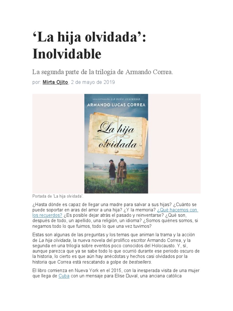 La hija olvidada (Daughter's Tale Spanish edition) Audiobook by Armando Reseña de La hija olvidada de Armando Lucas Correa: amor, amistad... La Hija Olvidada Libro La Hija Olvidada - Armando Lucas Correa | Envío Gratis El Regreso De La hija olvidada surgió de un encuentro que había evitado por años. Tenía el presentimiento de que si provocaba esa visita nunca terminaríaLa niña alemana