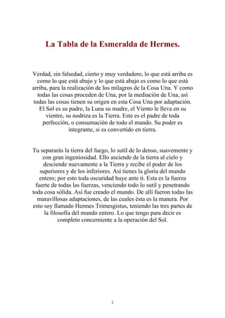 La Tabla de Esmeralda de Hermes Trismegisto - - Arte y simbolismo - Universidad de Barcelona Aunque se atribuye a la legendaria figura helenística Herm Trismegisto, el texto de la Tabla de meralda aparece por primera vez en varias fuent árab... Hermes Trismegisto La Tabla De Esmeralda De - - Arte Y La Tabla Esmeralda Pdf La Tabla de Esmeralda de Hermes Trismegisto Presentación de las dos versiones más conocidas de la Tabla de esmeralda, traducidas por Juan Graal. Se trata de la versión del «Kitâb sirr al-Halîka», de Apolonio de Tiana, con las citas de Ibn Umayl, conocido en latín como Senior Zadith y la llamada Vulgata latina procedente de «De Alchemia