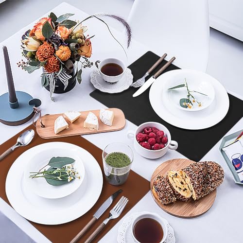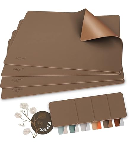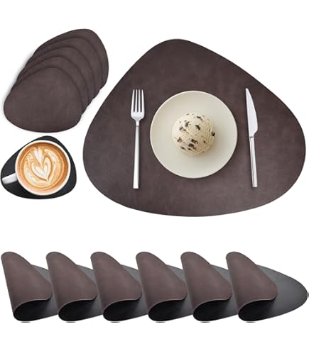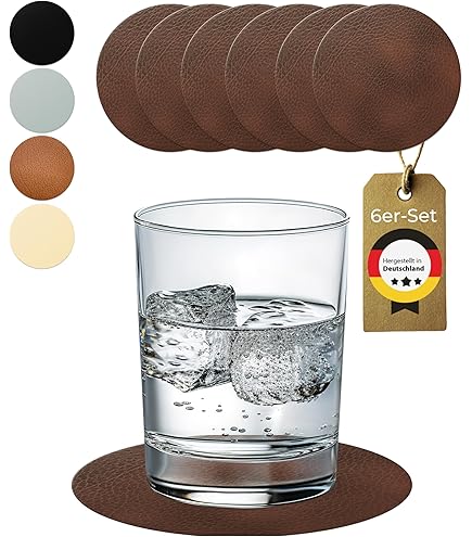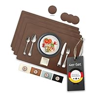 Sets de table élégants pour vous et vos invités, profitez de votre menu avec style à la table de salle à manger avec des sets de table modernes. La surface a un grain de cuir, noble mais pas trop discret. Les articles eux-mêmes sont fabriqués à la main par l'usine de cuir Garnier GmbH et en grande partie avec l'énergie solaire – durable, respectueux des ressources et respectueux de l'environnement. Lot De 4 Sets De Table Avec 4 Dessous De Verre, Motif Floral Lot de 4 sets de table et dessous de verre assortis Lederfabrik Garnier lavables et en cuir véritable recyclé. Indéformable et stable. Ces sets de table ne sont pas de simples accessoires, mais des pièces qui racontent une histoire, ajoutant une touche d'élégance intemporelle à votre espace. ✔ Dimensions : 39 x 35 cm, dessous de verre de 11 cm de diamètre., Épaisseur : 1,5 mm. ✔ Facile à nettoyer : il suffit de l'essuyer avec un chiffon humide et la surface est scellée et reste propre et hygiénique. ✔ Matériau de haute qualité : cuir recyclé durable, fabriqué en Allemagne. Sets de table et dessous de verre en cuir lavables Lot de 4 sets de table lavables et dessous de verre - En cuir - Lavables - Double face - Antidérapants - Aspect cuir - Marron marron foncé · Marron Marron... Avec sa forme originale tout en courbe, la version 'Organic' de nos sets de table apporte une touche de modernité et de style distinctif à votre table. Dimensions : 39 x 35 cm, dessous de verre ovale de 11 cm de diamètre.