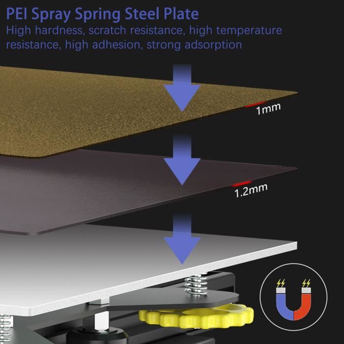 La déconnexion et le nettoyage du modèle sont un jeu d'enfant grâce au côté PET lisse, tandis que le côté PEI givré offre une adhérence supérieure et empêche la déformation. Spécifications :Type d' : Plaque de construction magnétique en acier à ressortTaille du produit : env. Plaque d'impression Pei lisse 235x235,tôle d'acier à ressort magnétique,plaque de construction... 0,4 mm/0,02 poucesCôté PET : env. [RÉSISTANT À LA CHALEUR] : Avec un aspect d' PET résistant à 120°C et un revêtement PEI résistant à 260°C, cette plaque de construction peut supporter la chaleur de la plupart des matériaux d' 3D. [EXCELLENTES PERFORMANCES] : Fabriquée avec une finition soignée, cette plaque de construction en acier à ressort magnétique garantit durabilité, stabilité et résultats d' exceptionnels. 2,1 mm / 0,08 poucesComment utiliser :Installer et utiliser directement. Tbest Plate-forme de lit en acier à ressort PEI Plaque de Construction Magnétique, 3D de [FILAMENT COMPATIBLE] : imprimez du PLA sur le côté PET et utilisez l'aspect PEI pour imprimer une variété de filaments tels que le PLA, l'ABS, le PETG, le TPU et le . Seul le filament PLA est imprimé sur l'apparence du bâtiment PET ; Le panneau d'apparence PEI peut imprimer la plupart des filaments, tels que le PLA, l'ABS, le PETG, le TPU, le . [PLATEFORME D' DOUBLE FACE] : Profitez de la polyvalence d'une plate-forme PET lisse et d'un aspect givré PEI sur cette plaque de construction magnétique en acier à ressort. Plaque De Construction Magnétique Double Face En Tôle D'acier à Ressort Plaque de lit PEI - VBESTLIFE - Acier à ressort - 150mm - Résistant aux hautes températures... Le panneau de construction PEI et PET à texture double face a une taille de plate-forme de 150 x 150 mm, adapté aux imprimantes 3D et autres modèles. L'apparence d' PET de la plaque de construction magnétique en acier à ressort est résistante à 120 ℃ et le revêtement PEI est résistant à 260 ℃.