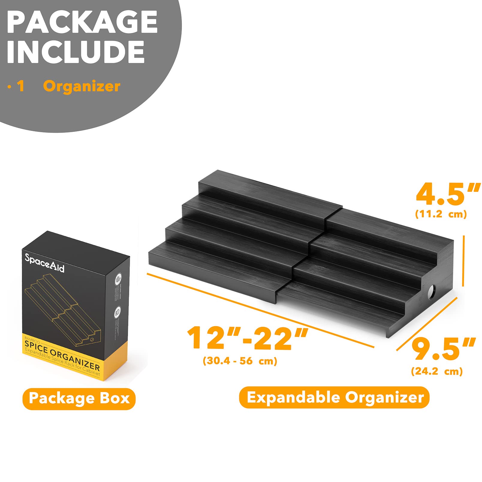 SpaceAid Étagère à épices en bambou pour armoire, garde-manger, épices pour armoires, assaisonnement de la maison, étagères en bois (4 niveaux, naturel) Facile à utiliser et à déplacer : aucun assemblage nécessaire ; ajustez la largeur de l'étagère pour l'adapter à l'espace de votre armoire de maison ; les poignées latérales permettent de soulever et de déplacer l'étagère à épices très facilement SpaceAid Organisateur de tiroir à épices en bambou, à 4 niveaux réglable de 12 po à 23 po de largeur (aucun bocal inclus) et Commentaires - Canada Matériau. Bambou · Couleur. Noir · Fonctionnalité spéciale. Expansible · Dimensions du produit. 24,1P x 43,2La x 11,4H centimètres · Type d'étagère. Étagère multi... Construction robuste : fabriqué en bambou solide durable au lieu du plastique ; assez robuste pour contenir différentes tailles de pots à épices, bouteilles d'huiles essentielles, liqueurs, cosmétiques comme le rouge à lèvres et même des conserves SpaceAid Étagère à épices En Bambou à 4 Niveaux Pour Armoire, Garde-manger Et Tablette De Rangement Pour Assaisonnements Et Commentaires - Canada Organisé et beau – Rendez votre armoire de cuisine propre et organisée avec l'étagère à épices en bambou. Plus d'épices dans moins d'espace : la profondeur de chaque niveau est de 5,6 cm de profondeur et 2,8 cm de haut ; l'organisateur d'épices peut contenir un grand nombre d'épices dans une petite zone. L'étagère à épices est extensible et réglable de 30,5 cm de large à 55,9 cm de large SpaceAid Étagère à épices avec 24 pots à épices, 386 étiquettes à épices, marqueur à craie et entonnoir pour armoire, comptoir, garde-manger, placard ou porte et support mural – 24 pots, 30 x 27,4 cm