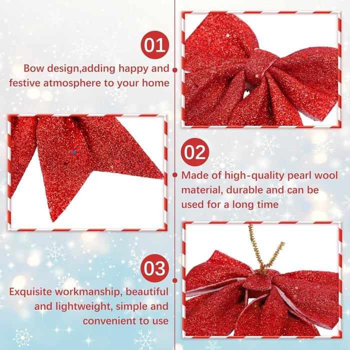 🎀【Matériau de haute qualité】Ces nœuds pour arbre de Noël sont en coton perlé EPE de haute qualité. Il peut être utilisé de nombreuses fois. 🎄【Facile à installer】L'arche se suspend directement au sapin de Noël ou se colle sur les boîtes à cadeaux de Noël, les fenêtres, les chaises, les armoires et autres endroits. C'est aussi un bon choix pour les accrocher aux portes et aux clôtures de jardin. Rouge Vert Nœuds de Noël, 12 Pièces Noeud de Ruban de Noël, Nœuds Sapin Ils ajoutent plus de confort à votre décoration de Noël et créent une atmosphère festive et festive. Les nœuds sont ornés de paillettes colorées et créent une ambiance festive qui a été le point fort du sapin. 🎁【Les applications sont larges】Les boucles décoratives de Noël exquises conviennent très bien comme ornements pour décorer les sapins de Noël, les fenêtres, les emballages de cadeaux de Noël, les fêtes de Noël, les mariages et les fêtes d'anniversaire. Udbrud Lot de 12 nœuds à paillettes pour décoration de Noël Ces mini nœuds de Noël sont une belle décoration de Noël. L'arc est doté d'un ruban doré à l'arrière qui se fixe et se détache facilement. De plus, il est léger et ne provoque pas de pression sur l'arbre de Noël. Les nœuds sont recouverts de paillettes colorées et créent une ambiance festive qui a été le point fort visuel sur le sapin. Ils ajoutent de la convivialité à votre décoration de Noël et créent une atmosphère festive et solennelle Ces nœuds de Noël sont très bien adaptés pour les décorations de Noël, faciles à démonter, les décorations suspendues, les mariages, les anniversaires, les emballages cadeaux, les décorations de plantes et de jardin Deco Sapin De Noel 96 Pièces Arc De Noël Ruban Rouge Noeud Pour Sapin De Noël, Sapin De Deco Noel Sapin Contenu de l'emballage - 12PCS Noeuds de ruban de noël pailletés.Taille (environ): 12 x 15 cm, Chaque nœud a des paillettes scintillantes pour créer facilement une atmosphère festive. beau design et excellente qualité de fabrication. Peuvent rendre vos articles plus attrayants et charmantsMatériau de qualité - Noeud noel à paillettes sont fabriqués en mousse de coton de haute... Ils ajoutent de la convivialité à votre décoration de Noël et créent une atmosphère festive et solennelle. Chaque boucle mesure environ 12 x 15 cm et a la bonne taille, est légère et portable, ce qui est très approprié pour la décoration parfaite des arbres de Noël, des jardins, des suspensions de porte, des tables à manger, des ornements et des boîtes cadeaux. 🎀【Des décorations de Noël parfaites】Ces mini-boucles de Noël sont une magnifique décoration de Noël. Vous pouvez non seulement décorer l'arbre de Noël, les couronnes et les cadeaux, mais aussi les mettre dans des boules de Noël transparentes et les accrocher à l'arbre de Noël ou à d'autres endroits, puis il y aura une sensation différente. Vous pouvez le fixer sans problème à tout endroit qui doit être décoré.