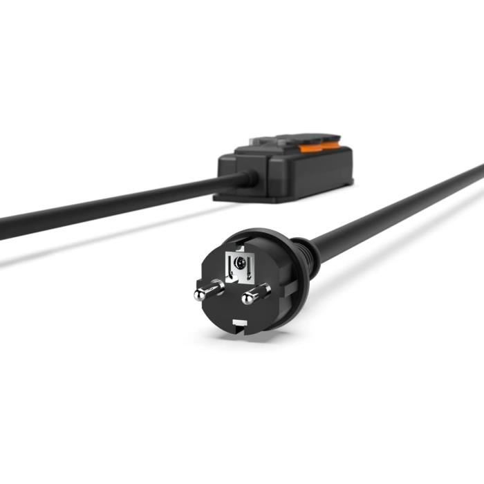 Bloc de prises étanches idéal pour une utilisation polyvalente : dans le jardin, sur la terrasse, au garage, à l'atelier ou sur un chantier La décharge de traction et la protection contre le pliage sur la fiche et la multiprise protègent contre la rupture de câble Avec protection renforcée contre les contacts accidentels afin d’éviter tout contact involontaire Inserts de prise orientés à 45°, 6 prises de terre Contenu de la livriason: 1 x Multiprise étanche 4x16A Pour suspendre : œillets de suspension intégrés pour le montage mural BLOC MULTIPRISE EXTÉRIEUR Electrique Etanche 6 Prises Interrupteur... La multiprise Hama 4 prises pour extérieur IP44 est l'accessoire parfait pour tous vos besoins en alimentation extérieure. Interrupteur marche/arrêt bipolaire éclairé en rouge, idéal afin d’éteindre les appareils inutiles et en veille Multiprise Etanche Pratique : 4 prises IP44 Schuko avec interrupteur M/A et accroches murales pour suspendre et fixer au mur. Moxom Multiprise Rallonge 2m, Bloc de 4 Prises, 6 ports Usb 3.4A et 2 Prises inclinées à 45° pour brancher facilement des appareils avec des fiches volumineuses ou angulaires Rallonge Multiprise Haa Ultiprise Etanche 6 Prises Avec Interrupteur (ultiprise Multiprise Exterieur Caractéristiques techniques :Couleur NoirConnecteur Prise avec contact de terreAlimentation 250 VCaractéristiques principales 16 ACharge maximale 3680 WType de câble H05VV-F3G1,5Fonctions InterrupteurMatière PlastiqueNombre de conducteurs 3Nombre de prises 4Dimensions Largeur x Profondeur x Hauteur 7,2 x 3,2 x 32,2 cmLongueur du câble 2 mSection des conducteurs 1,5 mm² Câble de 2 m pour plus de flexibilité. Classe de protection IP44 : multiprise d’extérieur étanche aux projections d’eau pour le jardin, le garage, le chantier, etc. Protection contre les projections d'eau IP44 Classe de protection IP44 : multiprise d'extérieur étanche aux projections d'eau pour le jardin, le garage, le chantier, etc Conçue pour résister aux intempéries, elle est dotée d’une protection IP44 qui assure une protection contre les projections d'eau et la poussière, garantissant ainsi une utilisation en toute sécurité dans des environnements divers tels que jardin, terrasse, garage ou chantier.