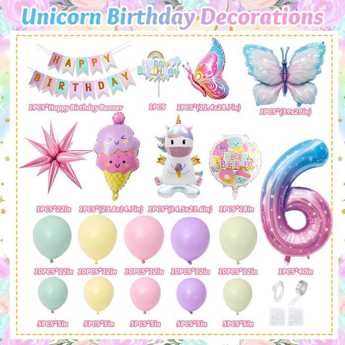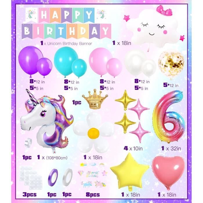 L'ensemble de ballons Licorne est équipé d'un ballon macaron rose violet,d'énormes ballons licornes,d'un dessus de gâteau,etc. vos rêves de fête de conte de fées. Si vous n'êtes pas satisfait de l'ensemble de décorations d'anniversaire de licorne. Decoration Anniversaire Licorne Fille, Kit Bleu Violet Rose avec 3D Feuille Confetti Ballons ✨【6 an Décorations de Fête d'Anniversaire sur le Thème de la Licorne】:Voulez-vous donner une fête surprise à votre bien-aimé qui est un super fan de licornes?Il ne fait aucun doute que la fête de décoration sur le thème de la licorne est le rêve de toutes les filles. ✨【Facile à Utiliser】:Décorations de fête d'anniversaire de ballons de licorne adaptées à la fête des enfants, à la fête d'anniversaire de bébé, aux réunions de famille, aux décorations de fête à la maternelle,etc. Joyeux Anniversaire,Ballons Licorne,Géants Ballons Numéro 6 pour Bébé Filles Anniversaire Deco · 4,44,4 sur 5 étoiles (460) · 9,99 €9,99€ · Livraison GRATUITE... 💌【Garantie de qualité】:Nous nous consacrons à fournir le meilleur service client et à offrir la meilleure expérience d'achat à chaque client. fière allure lorsque vous l'accrochez comme toile de fond de fête. (Veuillez noter:si vous voulez que les ballons de licorne volent haut,vous devez les gonfler avec de l'hélium,l'hélium dans les ballons peut durer longtemps afin que vous puissiez facilement décorer votre fête., ) Ajoutez-le à votre panier maintenant, organisez une fête de conte de fées pour celui que vous aimez. dispose de plusieurs gammes de vaisselle d’anniversaire jetable à motif licorne, idéal pour un thème licorne. Elle s’accorde à merveille avec une décoration aux couleurs pastel comme un bleu ou un rose. Les gammes se déclinent en assiettes, gobelets, serviettes, pailles et même des nappes et chemin de table afin de compléter à merv... Voir la liste complète sur Rien de plus magique qu’un anniversaire licorne, c’est le thème idéal pour les petites filles fan de cet animal fantastique. Pour réussir votre décoration d’anniversaire sur le thème de la licorne, privilégiez les couleurs pastel comme du bleu, du rose et même du jaune. Elles s’accordent à merveille avec le thème licorne. Pour un anniversaire clé e... Voir la liste complète sur Retrouver l’animal mythique également sur les cartons d’invitation. vous propose des cartons pré-remplis et imprimés avec des enveloppes pour vous simplifier la vie. Vous n’aurez plus qu’à écrire et le tour est joué. Vous pourrez également retrouver prochainement nos invitations sur le thème licorne à imprimer sur notre blog. Voir la liste complète sur Que serait un anniversaire sur le thème licorne sans déguisement de licorne ? Il existe une multitude de déguisements pour enfant sur ce thème que ce soit la désormais célèbre combinaison licorne mais aussi de plus simples accessoires comme un serre-tête avec une corne multicolore, des chapeaux, des masques. Il y en a pour tous les goûts et pour to... Voir la liste complète sur Deco Anniversaire Decoration Anniversaire Décoration Anniversaire Licorne Fille - Kit Ballons, Nappe, Bannière - Rose - 1 à 7 Ans Pied De Licorne Ballon Anniversaire ✨【Ballons non Toxiques et de Haute Qualité】: L'ensemble de décoration de fête de ballons d'anniversaire de licorne violet est fait de latex naturel et de papier d'aluminium,non toxique et inoffensif,le ballon est solide et durable,prend en charge l'hélium ou l'air.