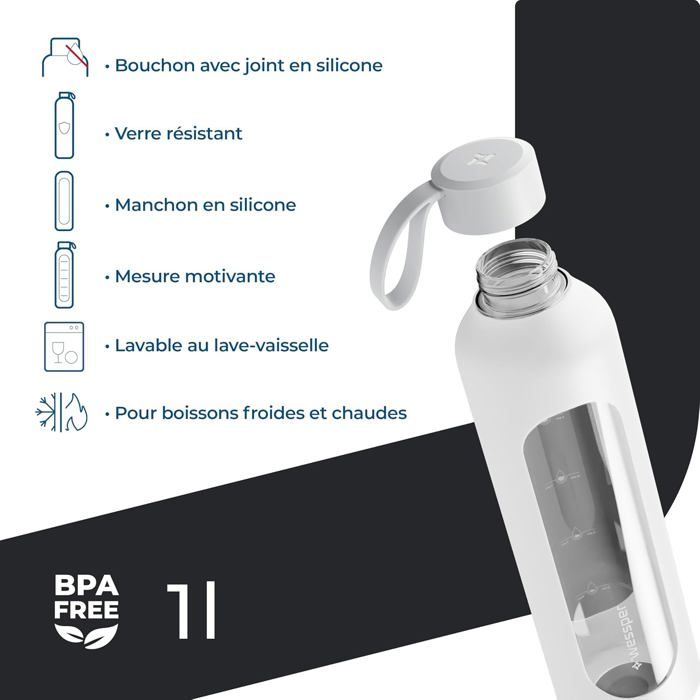 La combinaison de la clarté du verre de la bouteille et du boîtier en silicone coloré offre à la fois fonctionnalité et style. Le joint de qualité supérieure maintient votre boisson à l'intérieur, de sorte que vous pouvez la transporter en toute confiance. Bouteille en verre 1 litre - Trouvez le meilleur prix sur Bouteille d'eau avec marqueur de temps – Marqué avec des temps pour vous aider à boire de l'eau tout au long de la journée, cette bouteille de 1000 ml est parfaite pour vous garder bien hydraté. Caractéristiques : réutilisable, incassable avec étui en silicone, marqueur de temps. Contenu du paquet : 1 bouteille d'eau en verre avec couvercle en acier inoxydable et couvercle en silicone. Bouteille d'eau en verre de 1 litre avec couvercle en acier inoxydable – Bouteille de sport de 1 000 ml avec marqueur de temps, réutilisable et incassable en silicone pour fitness, gym, extérieur, voyage, entraînement Caractéristiques : Matériaux : verre, silicone, acier inoxydable. Il a une grande capacité de 1 litre pour vous aider à répondre facilement à vos besoins quotidiens en eau. Le manchon en silicone offre une durabilité et une prise ferme, adapté pour les activités vigoureuses ou les trajets quotidiens. Bouteille Eau en Verre de 1 Litre avec Couvercle en Bambou à Large... Le matériau est exempt de BPA, assurant que votre eau a un goût propre et frais à chaque fois. Bouteilles En Verre 1 Litre Bouteille En Verres 1 Litre - Bouteille D'eau 1000 Ml - Verre Borosilicate épais Gourde Verre Incassable Caractéristiques : Cette bouteille d'eau en verre de 1 litre, disponible en plusieurs couleurs, y compris rose, vert, bleu foncé, noir et bleu clair, est conçue pour vous garder hydraté avec des horaires marqués pour suivre votre consommation d'eau. Couleurs disponibles : rose, vert, bleu foncé, noir, bleu clair., Capacité : 1 litre (1000 ml). Bouteille d'eau en verre de qualité supérieure : fabriquée à partir de verre de haute qualité, cette bouteille d'eau est solide et peut supporter des températures extrêmes du froid au chaud, de -10 °C à 120 °C. Couvercle : acier inoxydable avec une corde robuste pour un transport facile. Son design pratique et son manchon de protection en silicone en font un compagnon fiable pour toutes sortes d'activités.