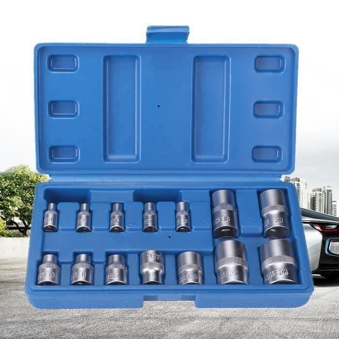 Tailles E-Torx, métriques et pouces, la forme spéciale de la douille permet de desserrer un écrou ou ou une vis En acier chrome vanadium, elles résistent aux chocs et à l'usure - parfaites pour dévisser les vis récalcitrantes de votre voiture, moto ou meuble en kit. Le... Douille A Choc 1/2 Douille Torx Femelle Jeu Douilles TORX Femelle 3/8 De E4 U00e0 E16 Clé Torx Femelle Produit conçu pour une utilisation dans les visseuses à percussion et les clés. Coffret Torx 14 Douilles Coffret De Douilles Torx Femelles – 14 Pièces De E4 à E24 - Bricolage Douille Etoile Ce matériau de qualité supérieure assure la résistance, la durabilité et la résistance à l'usure, qui peut être adapté aux situations de couple élevé et ne se casse pas facilement 🔧 Jeu de douille comprend--1/4: E4, E5, E6, E7, E8 ; 3/8: E10, E11, E12, E14 ; 1/2: E16, E18, E20, E22, E24 🔧 14 douilles Torx femelles--Douilles Torx de type E avec douilles étoile 1/4 3/8 et 1/2.