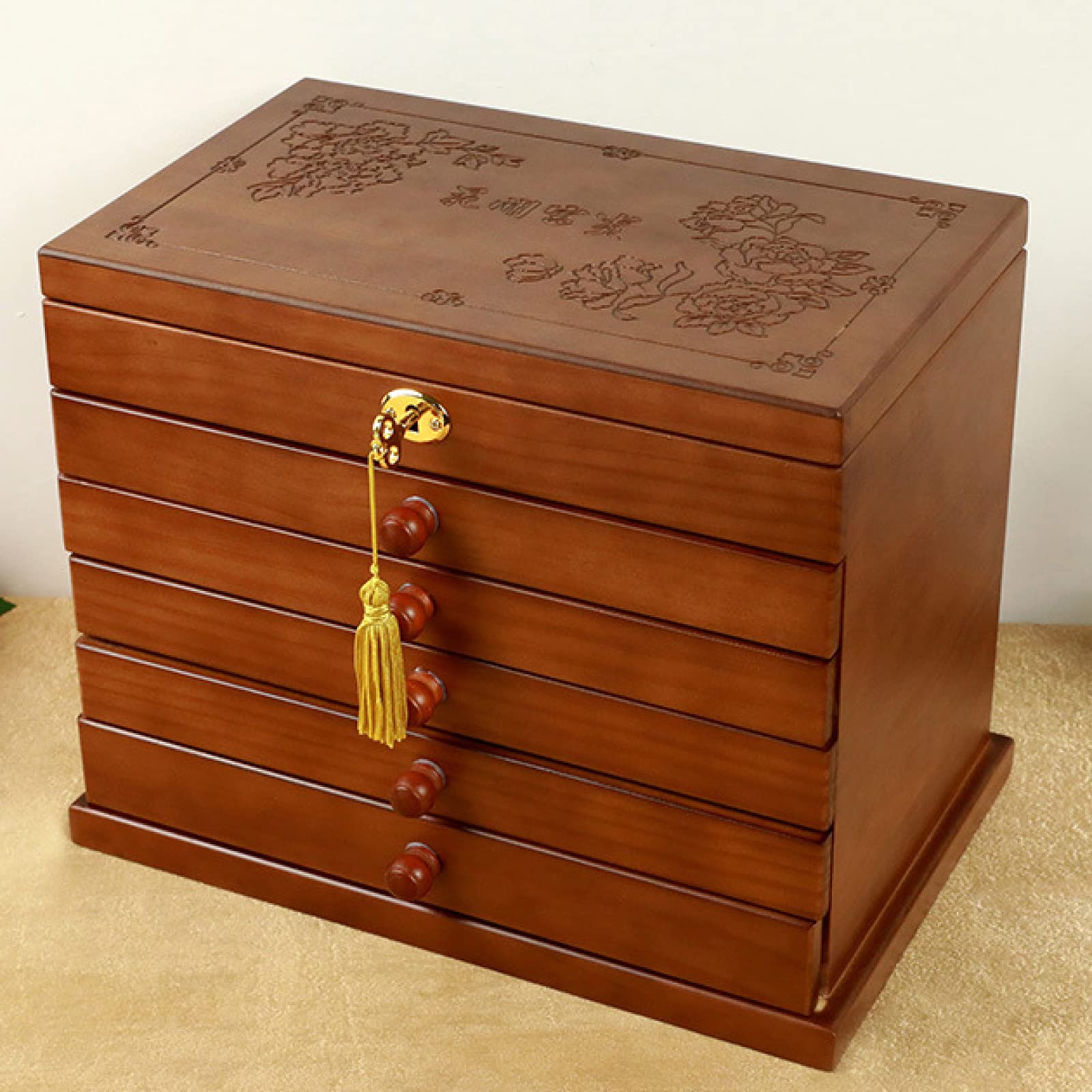 Tiroirs multicouches, grande capacité. Couleur du produit : couleur antique. Le rangement des bijoux Love est plus sûr, design de verrouillage complet, rangement sans soucis, sûr et sécurisé Protège durablement vos bijoux et les préservent de la poussière. Matériaux : Bois massif de noyer, microfibre, miroir, vernis Hauteur : 20 cm Largeur : 19 cm Longueur : 29 cm Poids : 4 Kg Stockage : bagues, collier, pendentif, boucles d'oreilles, bracelets Fermeture : tiroirs, serrure (clé fournie) Certification : CE (norme européenne) Couleur : bois marron Réf : 023AZ Description - Boite Coffret Secret Boisé La Boite à Bijoux - Coffret Secret Boisé est un produit unique qui vous permettra de ranger et d'organiser vos bijoux de manière élégante et pratique. Fabriqué en bois massif de noyer, ce coffret est non seulement beau, mais également durable et résistant à l'usure. Avec une hauteur de 20 cm, une largeur de 19 cm et une longueur de 29 cm, ce coffret offre suffisamment d'espace pour stocker vos bagues, vos colliers, vos pendentifs, boucles d'oreilles et Boîte à bijoux de grande capacité à cinq niveaux., Forme rétro simple. Maintient la texture claire de la bûche, la surface du vernis est pleine et humide, la couleur est calme et sobre, et les deux matériaux montrent des textures différentes. Avec une hauteur de 20 cm, une largeur de 19 cm et une longueur de 29 cm, ce coffret offre suffisamment d'espace pour stocker vos bagues, vos colliers, vos pendentifs, boucles d'oreilles et Miroir cosmétique haute définition, ouvrez le couvercle pour prendre une photo, clairement présent, rend l'habillage plus pratique Miroir argenté haute définition, illumine clairement votre beauté. Dimensions du produit : 24 cm x 19 cm x 28 cm. Montre en bois pour femme marron foncé • Essence du Bois Boite à Bijoux En Attente Boîte à Bijoux En Bois Pour Femme, Organiseur En Bois Massif Avec Serrure Combinée Pour Bijoux, Colliers, Bagues, Boîte De Rangement De Style Vintage Combiné Bois Cette boîte comprend un miroir intégré, 4 tiroirs amovibles et 2 armoires pivotantes, avec 17 compartiments, 6 crochets pour colliers, 21 empla Couleur du... Forme du produit : rectangulaire.