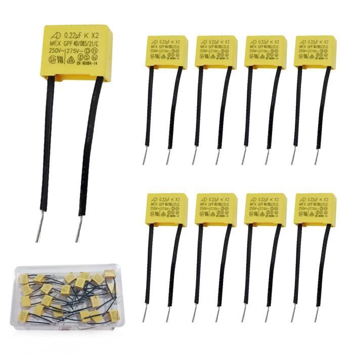 Application: largement utilisé dans divers produits électroniques et électriques, appareils électroménagers, composants électroniques, radiateurs, etc. Antiparasitage: Amélioration de la réception radio qui est perturbée par les produits LED. Condensatori per lampade a led: soluzione per luci persistenti Taille: 18,3 mm x 64 mm, longueur du câble PC: 50 mm, convient aux composants de haute densité de la carte de circuit imprimé. VERYNICE-MAP Kit assortiment condensateur sécurité DIP X2-275V Y1-400V 00022uF 2200pF 5 Kits... Commandes En Cours Vegena 10 Pièces Condensateur Polypropylène 0.22uf 275V X2 Condensateur Antiparasite LED Interrupteur Connecté Condensateur anti-parasites Capacity: 0,22µF (±10%), X2 radial, Voltage AC: 275V. Pas P=10mm X2 condensateur de sécurité, Type de montage: trou traversant, son type de montage par immersion.