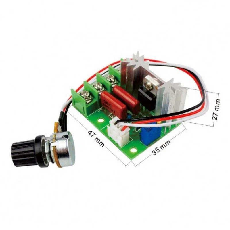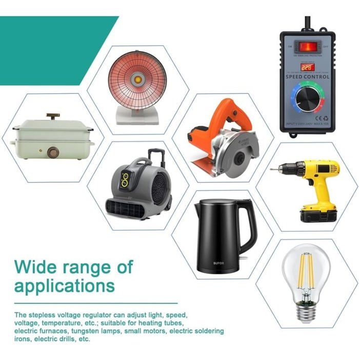 Il peut être utilisé comme par exemple les cuisinières électriques, les chauffe-eau thermiques, le variateur de lumière, la petite vitesse de rotation du moteur, le thermostat électrique en fer et la variation, les thermostats et l'effet de régulateur de pression. - Courant de sortie maximal : 25 A. Vous êtes intéressé ? Faites défiler vers le haut et cliquez maintenant sur le bouton « Ajouter au panier ». EN STOCK : Variateur de Vitesse pour Moteur, AC 50-220 V 2000 W 25 A Module de Commande de Vitesse de Moteur à Courant Alternatif Régulateur de Vitesse... Description : Ce contrôleur utilise un SCR bidirectionnel de haute performance. X 50-220 V 25 A AC Régulateur de vitesse du moteur Veuillez noter : 1., Les mesures étant prises à la main, les tailles indiquées peuvent varier de 0 à 2 cm. Découvrez notre gamme de régulateur de tension 220V AC pour faire varier la vitesse d'un moteur universel d'outils électroportatifs, de température, lampe, chauffage électrique. Veuillez considérer l'objet réel comme standard. Merci de votre compréhension., 2., Les écrans ne sont pas calibrés de la même manière. - Dimensions : environ 47 x 35 x 27 mm., Contenu : 1 pièce. Goodbuy-2000W AC 50-220V 25A Moteur Réglable PWM Tension Régulateur Contrôleur Vitesse ANGEEK Régulateur De Vitesse 2000 W AC 50–220 V 25 A Régulateur De Goodbuy-2000W AC 50-220V 25A Moteur Réglable PWM Tension Régulateur Contrôleur Vitesse... - Plage de régulation de la tension : 50 V-250 V CA (tension de sortie - Température ambiante de fonctionnement : -20 °C à 40 °C.