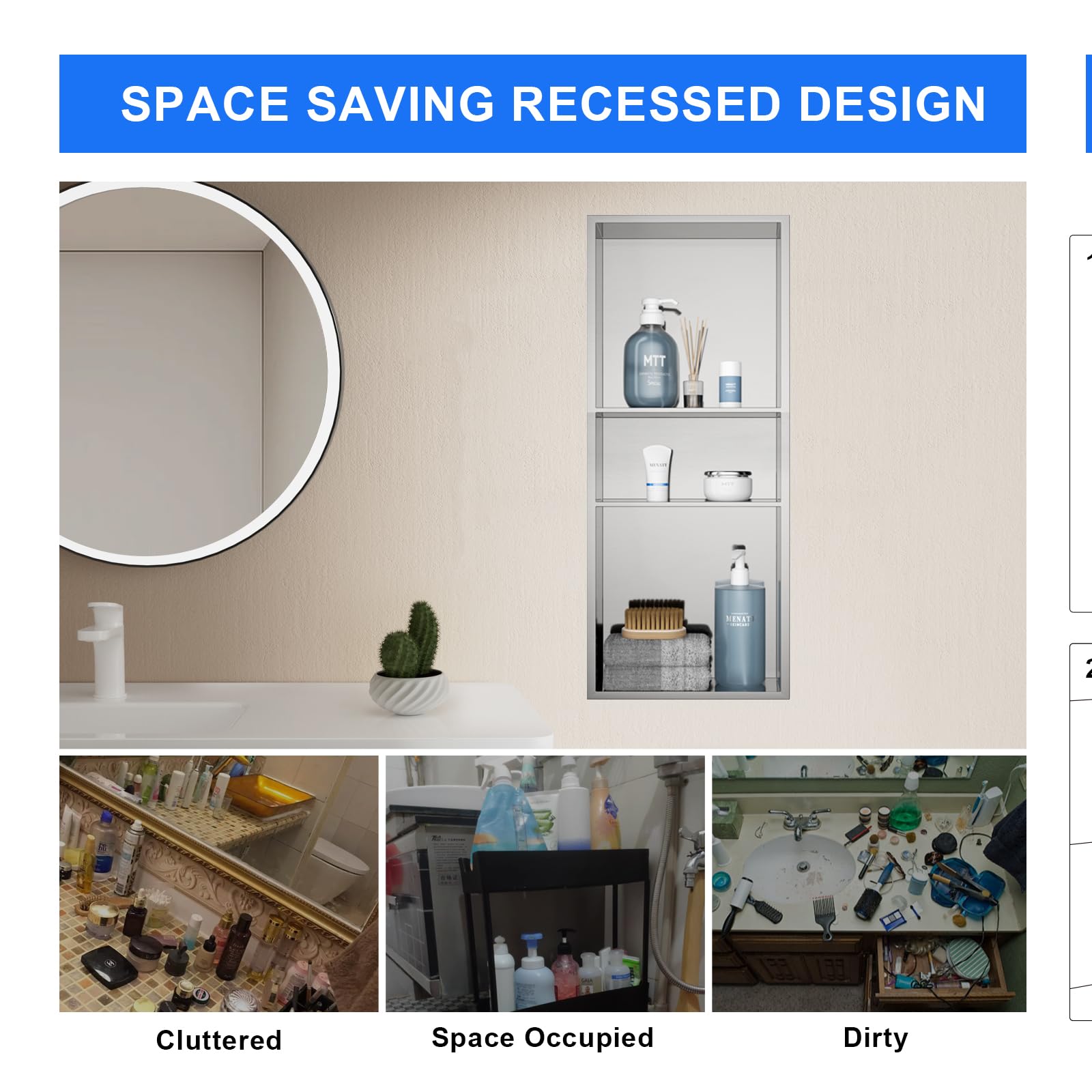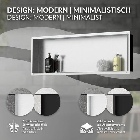 Profitez d'une installation sans tracas avec un look élégant et moderne en un rien de temps Niche de douche élégante et fonctionnelle pour une organisation sans effort. BERNSTEIN - Niche Murale Douche Chrome 30x30x10cm Acier Inoxydable Les multiples étagères vous permettent d'organiser soigneusement votre shampooing, savon et autres essentiels de bain, aidant à garder votre douche sans encombrement. Améliorez votre espace avec cette niche de douche de haute qualité et facile à installer dès aujourd'hui Imperméable et facile à nettoyer : le design d'angle intérieur à 92° présente une légère pente, cette niche de douche empêche l'accumulation d'eau, ce qui la rend facile à entretenir. Avec une base inclinée, cette niche pour douche empêche l'eau de s'accumuler, gardant votre rangement au sec. La surface lisse et non poreuse permet un nettoyage rapide et sans effort, assurant que votre salle de bain reste fraîche et hygiénique. Son matériau de qualité supérieure assure une longue durée de vie, parfait pour une utilisation quotidienne dans un environnement humide de votre douche Cette niche pour douche dispose de plusieurs étagères, offrant suffisamment d'espace pour le shampooing, l'après-shampooing, le savon et d'autres articles de toilette. Cette niche de douche s'installe facilement sans avoir besoin de carrelage, offrant une solution rapide et propre pour la rénovation de votre salle de bain. MENATT Niche De Douche En Acier Inoxydable 30,5 X 76,2 Cm, Niche Murale Niche de Douche SucceBuy 41 x 81 x 10 cm Double étagère Encastrée pour... Construction durable en acier inoxydable : fabriquée en acier inoxydable de qualité supérieure, cette niche de salle de bain offre une résistance exceptionnelle à la rouille et à la corrosion. Installation sans carrelage – Installation sans effort : évitez les joints et les carreaux désordonnés.