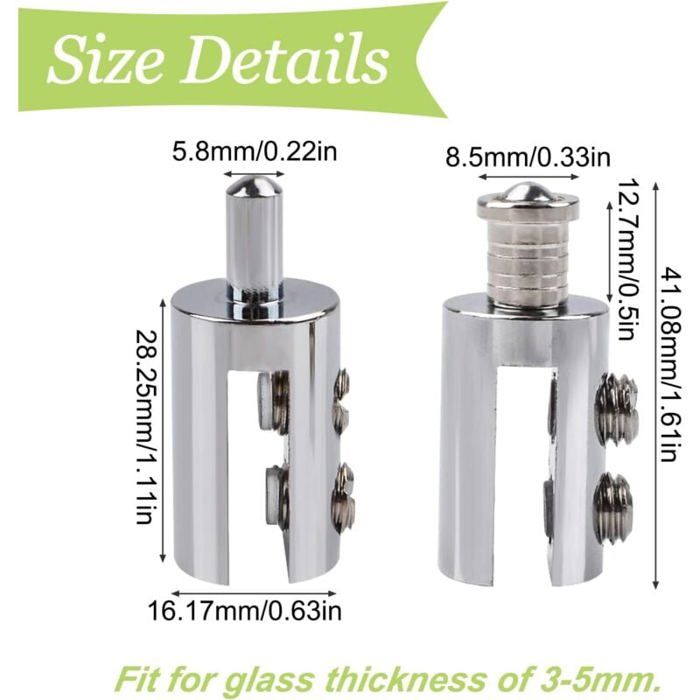 Charnière Pour Porte En Verre 5mm Couleur : argenté., Matériau : zinc. Conçu pour porte d'armoire, peut s'ouvrir. Conçu pour la porte de l'armoire, peut s'ouvrir à plus de 90 degrés. Aucun trou de perçage requis sur la porte vitrée. Tampon en silicone sur chaque vis, empêche les portes en verre de se rayer (les vis murales ne sont pas incluses CHARNIÈRES DE PORTE en verre sans tracas en acier inoxydable antirouille sans i EUR 6,28 - FR Qualité supérieure : Le clip de porte en verre avec broche est... Taille réglable, peut serrer le verre de 5 mm à 8 mm d'épaisseur Poignee De Porte 2pcs De Charnières De Porte En Verre Vitrine Armoire à Vin Clip Charniere De Porteadapte Pour Le Verre De 5 8 Mm Depaisseur Noir Charniere De Porte Pieces De Peut être utilisé sur une porte d'armoire, une porte de rangement de vin, une porte de vitrine, etc Coussinet en silicone sur chaque vis, empêche la porte en verre de se rayer (les vis ne sont pas incluses) 8 charnières de porte en verre fabriquées en zinc, relient la porte et le mur Achetez 4pcs Charnière Glass Door Clip, Charnière pliante en verre, Charnière de serrage de porte, Charnière pour armoire de cuisine Porte en verre. Remarque : la couleur de l'article peut de celle de la photo en fonction des paramètres d'affichage et de luminosité de votre ordinateur.