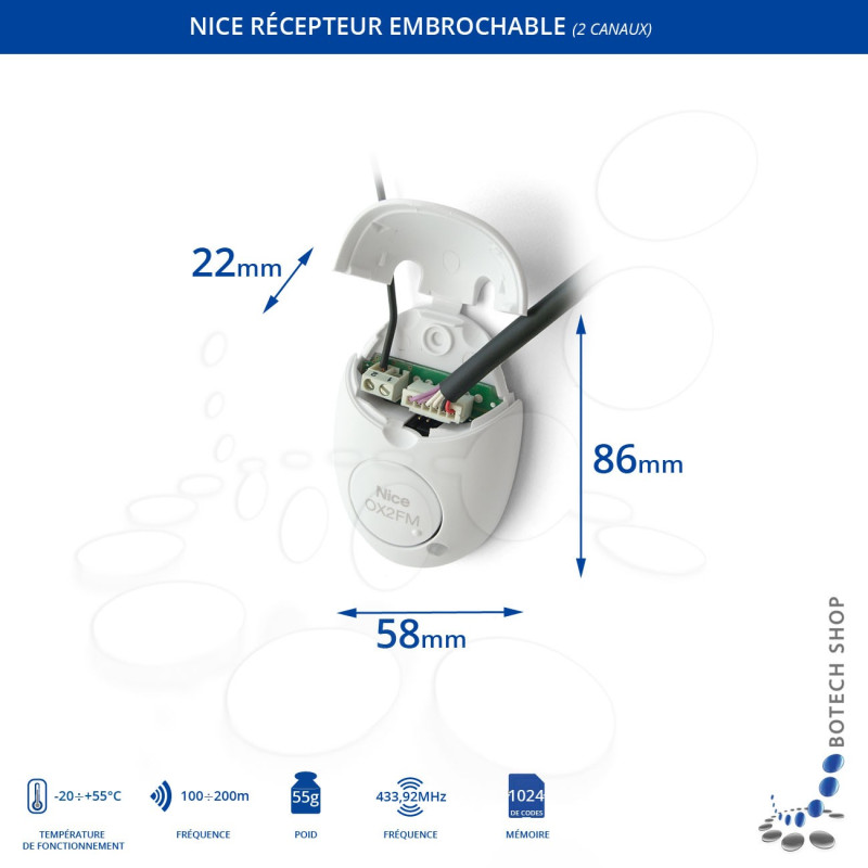 Récepteur radio universel NICE 2 canaux 12-24 V - FLO2XR - Bricolage Toutes les télécommandes enregistrées seront définitivement supprimées et ne pourront pas être restaurées. Chaque canal dispose d'un bouton d'apprentissage indépendant S1, S2., 3., Sélecteur d'entrée d'alimentation : ce récepteur fonctionne avec AC/DC 12 V ~ 30 V. Données techniques : Fréquence : 433 868 MHz (rolling code/fixed code) Canaux : 2 Alimentation : 12-24 V AC/DC (alimentation non incluse) Mémoire de l'émetteur manuel par canal : 200 Si vous réglez la portée de la télécommande contrôler la réception à 150-200 Si vous souhaitez augmenter les compteurs, vous pouvez connecter cette antenne : https://www., amazon., de/dp/B01MZYAPVN/ Le récepteur radio Nice FLOX2R est très robuste, il intègre la transmission par Rolling code pour plus de sécurité. Compatible avec les télécommandes Nice de la gamme Era, One et FloR avec une fréquence radio de 433.92 MHz La LED Will s’allume. Tous les câbles sont équipés de 4 entre le récepteur et la télécommande" La liste de sélection des marques se trouve dans les instructions incluses. c) Appuyez sur le bouton souhaité de la télécommande Nice. Compatible avec la plupart des commandes à code fixe et tournant 433-868 MHz, telles que : Liftmaster, Chamberlain, Motorlift, Homentry, Hormann, Marantec, Nice, V2, BFT, BENINCA, DOORHAN, TORMATIC, SEIP, Normstahl, NOVOFERM et bien d'autres. Telecommande Bft Récepteur Universel Flor-S, Flore, On, One, Inti Compatible Telecommande Portail Universelle Tous les câbles sont équipés de 4 entre le récepteur et la télécommande 2) Si vous souhaitez connecter ce récepteur à votre système, vous pouvez programmer jusqu'à 400 télécommandes<br/Instructions incluses. Compatible avec les télécommandes Nice FLO1R-S, FLO2R-S, FLO4R-S, FLO1RE, FLO2RE, FLO4RE, ON1, ON2, ON4, ON1E, ON2E, ON4E, INTI, Very VR 433,92Mhz 2) Si vous souhaitez connecter ce récepteur à votre système, vous pouvez programmer jusqu'à 400 télécommandes , Instructions incluses. b) Appuyez sur le bouton d'apprentissage. RÉCEPTEUR RADIO UNIVERSEL 433 MHZ Récepteur Radiocommande 24V 12V EUR... Pour les télécommandes Nice 433,92 MHz, faites glisser les commutateurs DIP 8 vers le haut., 2., Bouton LEARN et LED : Il existe 2 canaux indépendants.