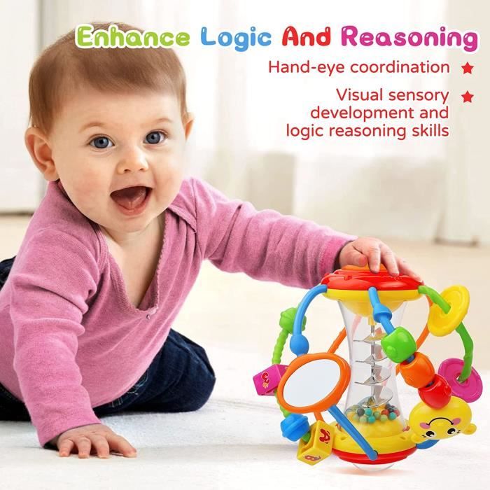 Inspiré de la pédagogie Montessori, il combine balle de préhension, hochet et anneau de dentition pour stimuler la perception sensorielle et le développement moteur. Mothinessto Jouet sensoriel d'anneau de décompression Anneau de Balle de Préhenson Montessor / Hochet, Anneau de dentton naturel... Matériau sûr & sans BPA – Fabriqué en silicone de qualité alimentaire, testé selon les normes de sécurité EN71, totalement sans danger pour les petites mains et la bouche des bébés. Cadeau parfait pour bébé – Idéal comme cadeau de naissance, de baptême ou de Noël. Convient dès 3 mois, facile à saisir et à utiliser comme aide à la dentition. Un jouet d’éveil qui associe plaisir et apprentissage. Facile à saisir – Convient dès 3 mois. Parfait comme cadeau de naissance, de baptême, de Noël ou pour le premier anniversaire. Un présent original qui fera plaisir aux parents et émerveillera les bébés. Jouet de dentition en silicone alimentaire et en matériau ABS, non toxique et sans BPA. A réussi les tests de laboratoire accrédités par la CPSC et est sûr pour les bébés à toucher, mâcher et ronger. La partie à mâcher a une texture équilibrée et deux textures différentes sur la surface, qui sont sûres pour les bébés. Elle aide à soulager les dents et à stimuler les sens. Un... Hochet Bebe 3-6 Mois Vuxava Jouet Bébé 3 Mois – Anneau De Dentition Montessori Sans BPA Balles Sensorielles Bebe Multifonctionnel – Balle de préhension, hochet et anneau de dentition en un seul jouet.