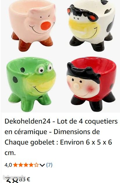 Si vous avez des questions, veuillez nous contacter, nous ferons de notre mieux pour résoudre tout problème pour vous Coquetier - Limics24 - Lot 4 Coquetiers Classiques Blancs Porcelaine Qualité Supérieure Cuillère... Matériaux durables et sûrs : fabriqués à partir de plastique de qualité alimentaire, ces coquetiers sont légers, robustes et sûrs pour un usage quotidien. Description du produit : Apportez joie et créativité à votre table de petit déjeuner avec cet ensemble de 5 coquetiers. Coquetier Enfant Garçon Toddmomy Lot De 24 Coquetiers En Bois Pour Enfants - Jolis Supports D'œufs De Dessin Animé Pour Activités Préscolaires - Matériau Sûr - Parfait Pour Les Décorations De Pâques Coquetier Oeuf Luxshiny Lot de 8 coquetiers mignons avec base pour œufs durs Motif dessin animé Vous aide à le fixer en place, sans vous brûler les mains sur les œufs chauds, ou obtenir le jaune partout. Nous vous proposons un choix varié d Parfait pour tous les âges : que vous serviez des œufs à la coque pour enfants ou des œufs durs pour adultes, ces tasses sont polyvalentes et adaptées à toute la famille. Parfaits pour contenir des œufs mous ou durs, ces coquetiers combinent praticité et charme fantaisie, ce qui en fait un incontournable pour les cuisines et les décorations de table à manger. Coquetiers de Pâques en Bois Support de Coquetier de Pâques Coquetiers en Bois Non Finis pour Le... Caractéristiques principales : Design unique et amusant : chaque coquetier présente un style de dessin animé joyeux et créatif, ajoutant une touche de plaisir à votre routine de petit-déjeuner et rendant l'heure des repas plus agréable pour les enfants. Excellent pour la décoration de la maison : non seulement fonctionnels, ces coquetiers servent aussi d'adorables décorations de table, parfaits pour les occasions spéciales ou les petits déjeuners à thème. Facile à nettoyer et à ranger : la surface en plastique lisse assure un nettoyage facile, tandis que le design empilable permet d'économiser de l'espace de rangement dans votre cuisine. Matériau des coquetiers fantaisie : le plateau à 5 œufs est fabriqué en matériaux de haute qualité, solides et ne se décolorent pas facilement, et a une longue durée de vie. Application : comme joli plateau à œufs décoratif, il est très approprié pour les restaurants, les cuisines et autres endroits où les œufs doivent être placés.