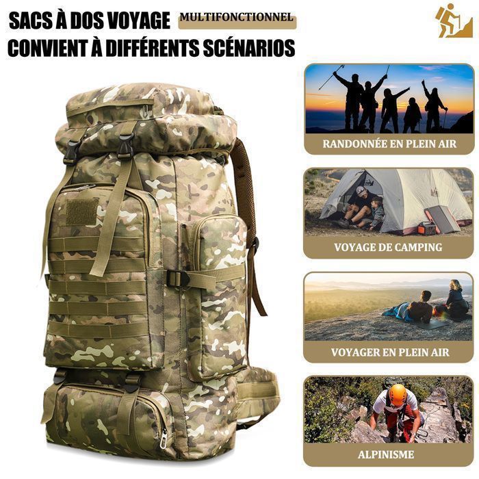 Grande capacité de 70 L : le sac à dos militaire est fabriqué en tissu Oxford 600D et en matériaux imperméables, ce qui le rend plus robuste, durable, résistant aux déchirures et aux rayures par rapport à d'autres sacs à dos de randonnée. Les bretelles élargies et épaisses en forme de S, ainsi que le panneau arrière respirant à haute élasticité, offrent une respirabilité optimale et réduisent la charge. En outre, nous avons équipé le sac à dos léger de plusieurs accessoires pour améliorer sa fonctionnalité externe, assurant une expérience utilisateur plus pratique. Sac De Trekking Dos Sac à Dos De Camping 70 L Pour Homme, Sac De Voyage, Sac à Dos D'escalade, Grand Sac De Sac à Dos 60 Litres Une ceinture de hanche et une bandoulière à ajustement personnalisé à la volée permettent aux utilisateurs de calibrer l'ajustement parfait, tandis qu'un Sac à dos de camping 70 L pour homme, sac de voyage, sac à dos d'escalade, grand sac de... Système Molle & Buckle & Strap : sac à dos de randonnée dispose de sangles à boucle en métal sur les deux côtés et sur le devant, permettant la fixation de pochettes tactiques, porte-bouteilles d'eau, packs d'accessoires, et plus encore. Vous prévoyez une randonnée de plusieurs jours, une expédition ou un trekking au cours duquel vous allez traverser de vastes étendues sauvages ? Beau programme en perspective, mais quid du sac à dos pour emporter le nécessaire pour un tel périple ? C’est là qu’intervient le sac de randonnée... Largement utilisé : le sac à dos pliable pèse 1,3 kg et mesure 34 x 17 x 73 cm (L x l x H), parfait pour transporter un sac de couchage, des chaussures, un hamac, un équipement de pluie, des vêtements, une tente, des aliments, une bouteille d'eau, des gants, un tapis et d'autres articles. Design ergonomique : le sac à dos de randonnée pour homme est équipé de bretelles réglables en maille respirante et d'une quantité généreuse de rembourrage en éponge, ce qui aide à soulager la pression sur les épaules. EGNMCR Sac à Dos Camouflage Multi Grande Capacité Fonctionnel, Sac à Bandoulière Double Ceinture Résistante à l'Eau Pochette Randonnée Escalade Sac à Dos Sac à Dos