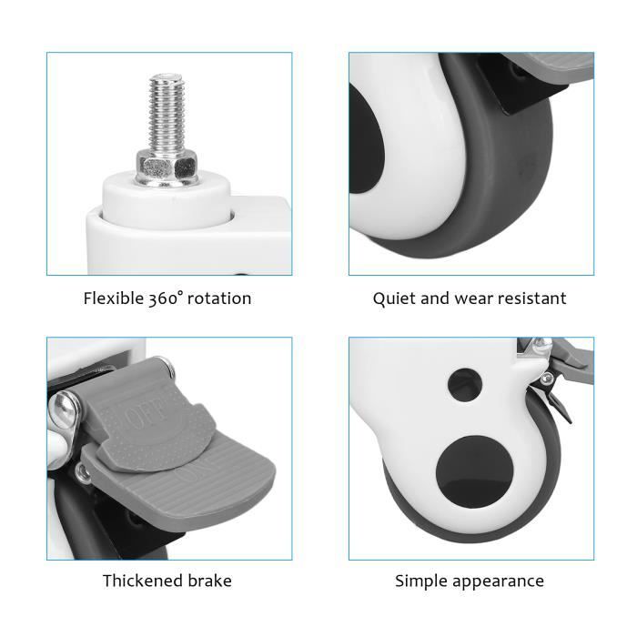 RÉSISTANCE À L'ABRASION: La meule de la roulette rotative a une bonne résistance à l'abrasion et ne rayera pas le sol. 4 Pcs Petite Roulettes Pour Meubles Roues Chaise Pivotante Adhesive Swivel Casters Cikonielf Roulette De Chariot 4pcs Roulettes Pivotantes De 1,5 Pouces Shock Roulette Roulettes Pivotantes Robuste, roulettes de 2 Pouces avec Frein, PU... APPLICATION LARGE: La roulette pivotante est largement utilisée, adaptée à divers chariots, meubles, chariots à manger, chaises de bureau, etc. Disponible en 3 versions : Roulette fixe sans frein (2.300 kg) Roulette pivotante sans frein (2.600 kg) Roulette pivotante avec frein (3.100 kg) Veuillez noter que les roulettes peuvent comporter quelques légères petites éraflures qui ne font d'ailleurs qu'accentuer le côté industriel. La table à roulettes est facile à déplacer, résistante à l'usure, et sans trace. FAIBLE RÉSISTANCE: La roulette rotative a les caractéristiques d'une faible résistance au démarrage et résistance au roulement, à faible bruit et un roulement silencieux et lisse. ROTATION À 360 DEGRÉS: La rotation à 360 degrés de la roulette pivotante permet à la roulette de se déplacer de manière flexible dans différentes directions et de tourner de manière flexible. Dimensions hors-tout : Modèle à roue pivotante (pivot sur roulement à billes) : Hauteur : 165 mm Largeur : 100 mm Profondeur : 165 mm Diamètre de la roue : 125 mm Largeur de la roue : 50 mm