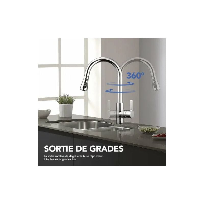 Cela rend le nettoyage plus facile et plus rapide et favorise la propreté de votre cuisine. Description du produit : Fabriqué en acier inoxydable de haute qualité, ce robinet est durable et résistant à la corrosion, avec une surface lisse qui est facile à nettoyer. Equipé d'une cartouche en céramique pour assurer une bonne étanchéité et aucune fuite, c'est une bonne aide en cuisineinstallation facile : suivez les étapes d'installation du manuel d'instructions pour installer et utiliser ce mélangeur de cuisine pratique en quelques minutes Questions fréquentes (Q&A) Q1 : l'installation de ce robinet est-elle difficile ? A1 : non, l'installation est simple. Q2 : à quelle distance la pomme de douche peut-elle s'étendre ? A2 : le pommeau de douche peut être étendu jusqu'à 45 cm, ce qui vous aide à nettoyer les gros articles ou à couvrir l'ensemble de l'évier. Cartouche en céramique fiable et économe en eau : testée sur plus de 800 000 cycles, la cartouche de qualité supérieure empêche les fuites et garde votre cuisine propre et bien rangée. Le robinet est conçu pour être facile à utiliser et est livré avec tous les outils nécessaires, ce qui vous permet de l'installer facilement en environ 20 minutes. Robinet D'Évier De Cuisine, Robinet Extractible Pour Eau Chaude Et La surface lisse et brillante est facile à nettoyer et ne laisse pas de taches d'eau. La conception améliorée de la poignée assure la stabilité lors de l'utilisation et offre une sécurité même en cas d'utilisation quotidienne et intensive. La boule de gravité, sécurisée avec un bouchon à vis, garantit que la tête de douche est tirée doucement et en toute sécurité. Robinet Cuisine Robinet De Cuisine En Acier Inoxydable, Robinet De Douche Extractible Mitigeur De Cuisine A Levier Unique 75809988 Robinet Evier Extensible et flexible : le robinet de cuisine avec douchette extensible permet une extension jusqu'à 45 cm et une rotation à 360 °, ce qui permet d'atteindre... Construction durable en acier inoxydable : ce robinet de cuisine est fabriqué en acier inoxydable de haute qualité, incassable et résistant à la corrosion, avec une durée de vie jusqu'à cinq fois plus longue que les robinets standard. Q4 : Comment changer les types de jet d'eau ? A4 : vous pouvez facilement basculer le type de jet d'eau en appuyant sur le bouton sur le pommeau de douche pour basculer entre le mode pulvérisation et jet en fonction de vos besoins de nettoyage.