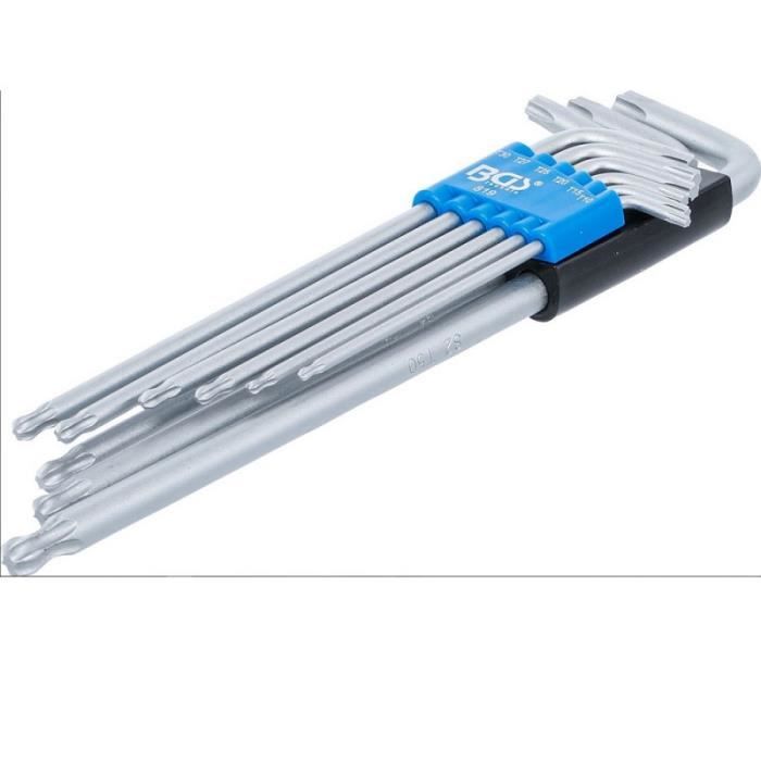 Tailles Torx : T10, T15, T20, T25, T27, T30, T40, T45 et T50 , Finition polie Fourni dans un organiseur à clip en plastique BGS Winkelschlüssel Satz T Profil 9 teilig 35105 Clés Torx Juego 9 Llaves Torx Extra Largas CRV 9 Pzas T10 A T50 DOGHER Cle Torx Facom Jeu de clés mâles Torx et Resistorx - Diamètre minimal et maximal de la tête : T10-T50 - Gainée. Jeu de 9 clés Torx extra longues avec tête sphérique Clé à double extrémité Torx avec profil de sortie sphérique côté long. Permet de visser à un angle allant jusqu'à 25 . Comprend : Clé T10 : longueur de la lame (côté court) : 19,5 mm / longueur de la lame (côté long) : 104 mm. Clé T15 : longueur de la lame (côté court) : 22 mm / longueur de la lame (côté long) : 116,5... Contenu : 9 clés Torx (T10-T50). Et ici, nous promettons la qualité. Pour toute question et problème, n'hésitez pas à contacter notre service avant vente et service après-vente. Nous allons résoudre votre problème dans les 24 heures. Voir plus de détails Vous avez des questions à propos des informations du produit en français...