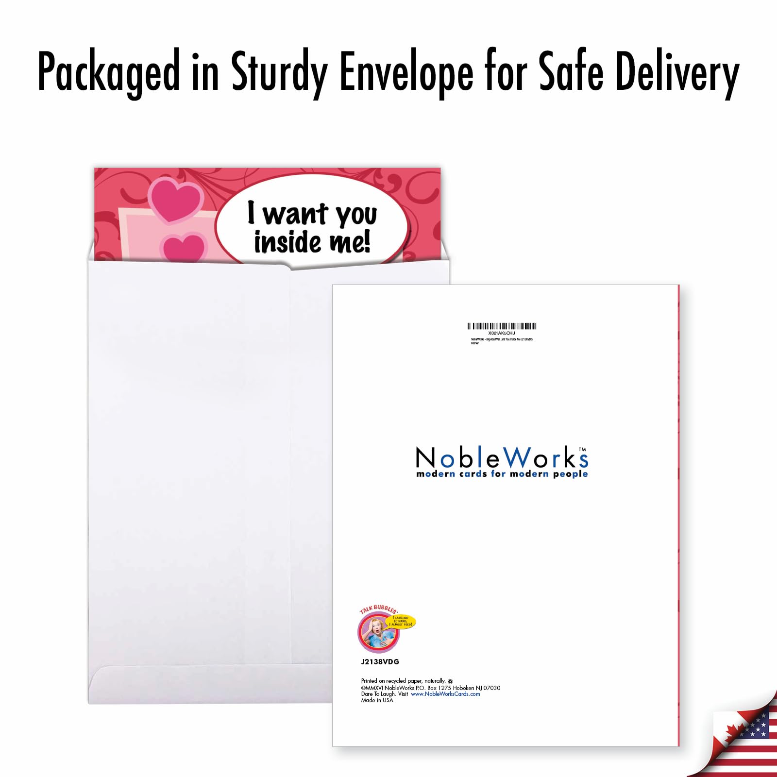 Vous souhaitez envoyer une carte humoristique à quelqu'un ? Faites vos amis amour drôle blagues ? nobleworks est votre humour entreprise. 2138 'Want You Inside Me' – Drôles De Saint-Valentin Carte De Vœux Il ou elle ne pourra pas rester de glace avec cette carte Pop up : 4 cubes se forment pour écrire « LOVE YOU » Un travail minutieux réalisé avec : Du papier d’au moins 220g/m² Au format rectangle – fermé 9x18 cm à triple volet Une enveloppe 11x22 cm offert Dans le détail, la carte est composée de : Papier rouge Papier noir à pois Cœurs réalisés avec une matrice de découpe Mot « love » réalisé avec une matrice de découpe L’inscription « la vie est belle a tes cotés » fait avec un tampon et de l’encre rouge Cœurs rouges tamponné à l’encre rouge à l’intérieur Lettres « LOVE YOU » réalisé avec des matrices de découpe Certains styles sont disponibles vierge ou avec un message d'accueil , Imprimé aux États-Unis Vous trouverez des poèmes politiques de blagues, drôle, humour, rétro style vintage conceptions, et à peu près tout sous le soleil., Appréciez. nobleworks est une entreprise d'impression, impression uniquement ce que vous commandez. Lignes présentés comprennent les bulles de parler, planète fabuleuse, Mortal sins, dessins animés, passive agressive, oreilles de lapin, drôle, du papier et de pensées de joie. NobleWorks, Funny Surgery C10822SUG Carte de vœux avec enveloppe Avec des dessins de Tim whyatt, Tom cheney, Leo cullum, Daniel Collins, Stan eales, Glen Hanson, éphémères, Last Kiss, Dan Reynolds, Chris mars, glenn mccoy, Gary mccoy, Liza donnelly, John callahan, hebdomadaire news, et bien d'autres, vous êtes certain de trouver une carte pour la personne que vous aimez. Comprend recyclables enveloppe assortie C'est un peu suggestif, avec une touche de mignon, et beaucoup de drôle. Tout mari ou petit ami va adorer recevoir le message sur cette carte. Et toute petite... Une carte de Saint Valentin originale ! Para una ocasión tan especial, necesitas sacar todo el romance. Nuestras enormes tarjetas de felicitación de 8.5 x 11 pulgadas se pueden describir como extragrandes, grandes, grandes o de gran tamaño, pero una cosa es segura... tienen un impacto extra grande y dejan grandes impresiones memorables
