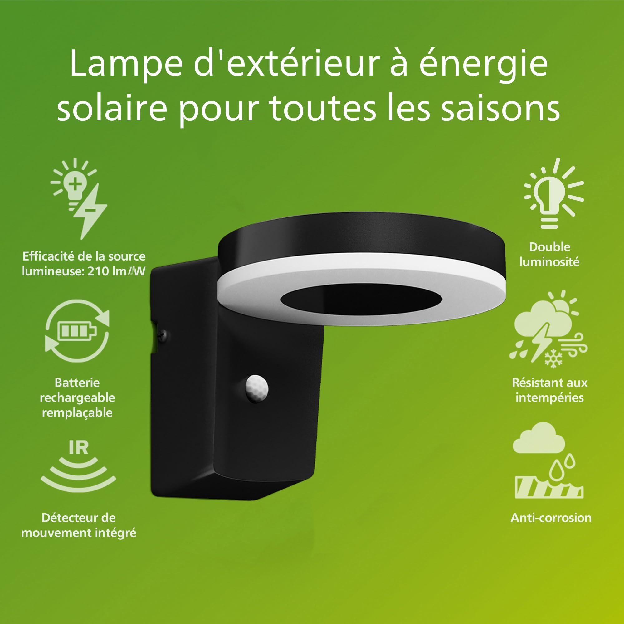Luminaires LED d'extérieur Philips, conçus pour fonctionner dans toutes les conditions météorologiques. Lampe de jardin solaire longue durée pour toutes les saisons À la fin de sa durée de vie (économique), éliminez le produit conformément aux règles locales et ne le jetez pas avec les ordures ménagères ordinaires. L'élimination adéquate de votre produit contribuera à prévenir d'éventuelles conséquences négatives pour l'environnement et la santé humaine Applique Murale Solaire Exterieur Philips Shroud Applique Murale Extérieure Solaire 2,3W Avec Capteur De Mouvement Verre Transparent Noir Détecteur De Mouvement Solaire Lumières LED de haute qualité qui durent jusqu'à 25 000 heures Kit de 8 luces Halopin Luminatti de 3 W, 2700 K, G9, 220 V, Lm175... Profitez davantage de l'extérieur avec des performances élevées et une qualité durable grce à l'éclairage extérieur LED Philips. En plus de la garantie standard de 2 ans offerte pour le luminaire, Philips offre également une garantie de 5 ans sur le système LED (le module LED et le pilote). Aucun cblage requis - facile à positionner n'importe où à l'extérieur. La combinaison de la technologie LED et de l'énergie solaire fait de l'applique murale LED Shroud un choix efficace pour l'éclairage des façades, des entrées ou des terrasses sans raccordement électrique.