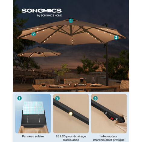 Frais le jour, romantique la nuit. Le haut des parasols de terrasse a des ouvertures de ventilation, qui peuvent garder l'air frais tout en permettant au vent de s'échapper. Lampes solaires au sol avec 16 LED, lampes solaires encastrées étanches, lampes solaires pour Parasol Déporté 1,5W en Fer et en Polyerster,Parasol de Jardin avec 6 Baleines et 18 Lampes à... Structure robuste : fabriqué avec un manche solide et résistant à la rouille et 8 baleines de 18 x 12 mm, ce parasol de table est conçu pour une utilisation durable. Grand Parasol Castorama Parasol De Terrasse Avec 8 Baleines Et 32 Lampes Led Solaires, Pour Table, Marché, Extérieur Parasol Extérieur Castorama Brunch avec des amis sur la terrasse, un après-midi insouciant en famille dans votre cour, un dîner romantique avec votre moitié dans le jardin., ., ., Ce parasol de jardin réalise chacune de vos idées Il offre une forte protection UV de UPF, un éclairage doux grâce aux 213 modes de clignotement RVB et une grande stabilité en cas de vent léger. [Tissu de qualité] : ce parasol de table est fabriqué en polyester durable de qualité extérieure résistant à l'eau et il peut résister efficacement aux forts rayons UV et à l'eau de pluie. Contrôle intelligent de l'application et du commutateur : en plus du contrôle traditionnel de l'interrupteur, le contrôle de l'application du smartphone est ajouté pour vous fournir plus de modes d'éclairage créatifs à faire soi-même, vous permettant de personnaliser votre propre mode d'éclairage de table de patio comme vous le souhaitez. Parasol 300cm avec éclairage solaire LED,32 lampes LED,protection UV UPF 50 ,pliable à 30°,pour...