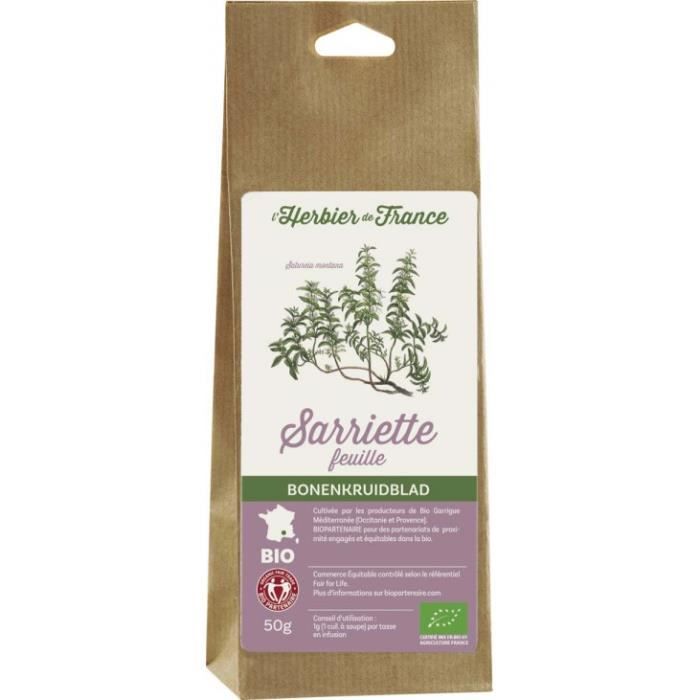 Une autre espèce de sarriette peut également se retrouver dans le commerce, en général sous le nom de sarriette des montagnes ou encore sarriette sauvage, mais il s'agit d'une espèce différente (Satureja montana) qui pousse sur les flancs montagneux d'Europe centrale. Appelée aussi pèbre d'ase (poivre d'âne en provençal) ou encore poivrette, elle entre dans la composition du classique mélange herbes de Provence au même titre que le romarin, l'origan ou encore le thym. Avec les poissons, il vous faudra surveiller le dosage, mais nous vous conseillons d'en saupoudrer sur un steak d'espadon grillé., ., ., C'est à tomber ! Sarriette Des Montagnes Fraîche Bio Description du produit Qu'est-ce que la sarriette ? Il s'agit d'une plante vivace (Satureja hortensis) de la famille des lamiacées que l'on trouve en France sur le bord des chemins dans le bassin méditerranéen ou elle pousse, aujourd'hui encore, à l'état sauvage. À soupe) par tasse en infusion. La sarriette en feuille entière est une plante qui facilite la digestion. Elle est aussi utilisée contre les ballonnements, les douleurs abdominales et les... La sarriette est une herbe au parfum unique évoquant clairement le poivre. Produit issu de l'agriculture biologique. Plante aromatique bio utiliser comme tisane ou décoction., 1g (1 cil. La sarriette est l'ami des légumineuses. Sachet de 40 g. Emballage 100% végétal, unique et respirant qui permet de conserver au mieux la saveur et la qualité des plantes, tout en respectant l'environnement Sobacha Japonais Infusion Sarriette Feuilles Bio - Infusions Et Décoctions - Be-Life - 40 G Feuille De Kadaif Idéal pour les poissons, les légumineuses et d'autres plats.
