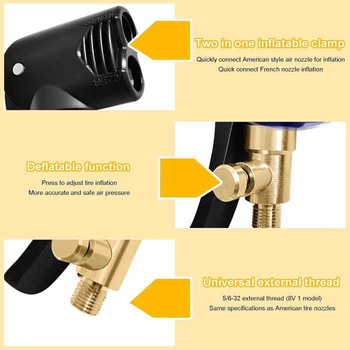 Adaptateur Valve Adaptateurs De Valve De Pompe, Adaptateur De Valve De Vélo à Valve Adaptateur Schrader Spécificités : L'adaptateur de pompe à air pour vélo est non seulement facile à utiliser, mais vous permet également de gonfler vos pneus rapidement et hermétiquement. Facile à utiliser : équipé d'un mandrin d'air verrouillable à 90 degrés et d'un filetage fin de valve de pneu standard, cet adaptateur de valve de vélo se place simplement sur la tige de valve du pneu et verrouille la pince pour un processus de gonflage très efficace qui n'a pas besoin d'être maintenu manuellement. Notre pompe de gonflage de pneus portable est conçue pour rendre la tâche de gonflage des pneus aussi simple et pratique que possible. La doublure d'air verrouillable à 90 degrés permet un gonflage mains libres, tandis que la construction entièrement métallique garantit durabilité et fiabilité SZSHIAO Adaptateur de Pope à air/à Pied, Valve de vélo (DV/AV/SV... Utilisation polyvalente : cet adaptateur de pompe portable a un débit d'air de 50 l/min, ce qui le rend idéal pour tous les types d'activités de plein air et l'entretien d'urgence des pneus. Adaptateur Gonfleur 2 Adaptateurs Valve Pneu 8mm - Laiton - Pour Que vous connaissiez une faible pression des pneus lors d'un long voyage ou dans la vie quotidienne, cet adaptateur de pompe à air pour vélo peut fournir un soutien puissant. Conception universelle compatible : chaque adaptateur de valve mesure 5,8 x 3 cm, le diamètre de l'articulation est de 1,5 cm, et la taille du filetage est de 0,8 mm, qui peut être utilisée pour la plupart des types de pneus, y compris les pneus américains, les vélos, les motos, ainsi que les voitures. Il est également équipé d'une fonction de vidange facile à utiliser qui vous permet de régler la pression des pneus avec précision si nécessaire. 2 Pièce Adaptateur de Valve de Pneu de Voiture, 8 mm Pompe de Embout Laiton Gonflage Valve Clip Pince Connecteur Adaptateur pour Pneu de Voiture ou Camion Boutique Nouveautés Favoris Opinions Contact 2 Pièce Adaptateur de Valve de Pneu de Voiture, 8 mm Pompe de Embout Laiton Gonflage Valve 136487836912 Matériau : alliage de zinc, laiton Couleurs : argenté, doré.