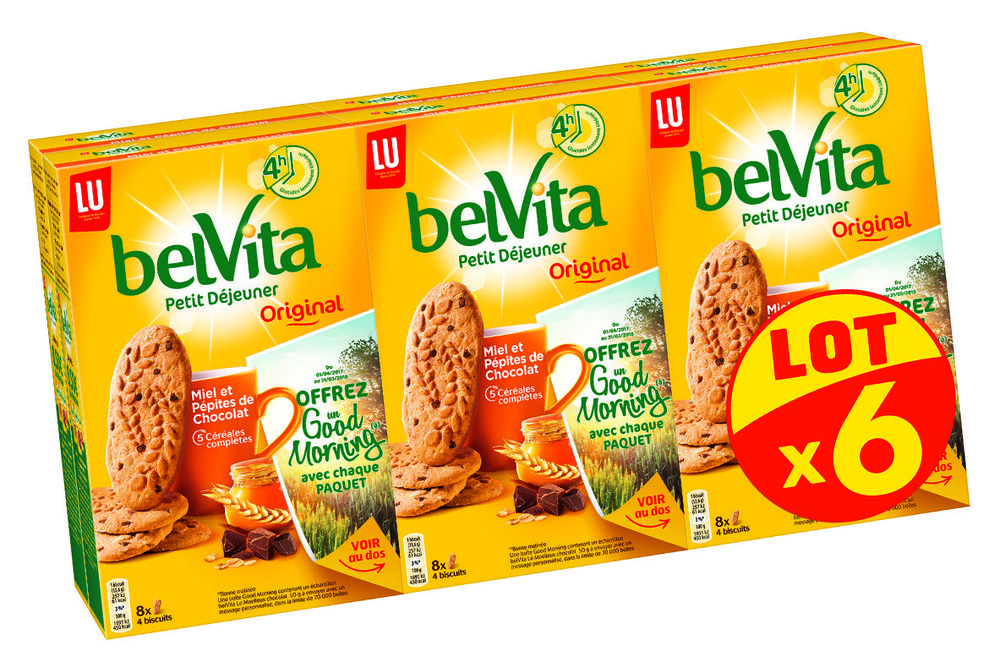 Description du produit Les biscuits Moelleux BelVita au cœur gourmand goût choco-noisettes sont composés de 5 céréales complètes. Convenient et polyvalent pour le petit-déjeuner, à emporter ou à réchauffer au micro-onde. Ce produit présente des caractéristiques de développement durable reconnues par des certifications fiables. Le produit contient au moins 95 % de matières biologiques LU - BISCUITS CEREALES AUX PEPITES DE CHOCOLAT BELVITA 250g de LU est vendu sur la boutique coursadom-fr dans la catégorie Biscuits Petit-Déjeuner Les indications ci-dessus sont données à titre d'information. * Mode d'emploi A consommer de préférence avant la date indiquée sur le dessus du paquet. Avec ces biscuits gourmands, toute la famille, adultes comme enfants, pourra se régaler. Ingrédients Céréales 40,1 % [farine de BLÉ 21,4 %, céréales complètes 16,4 % (gruau d'AVOINE 6,2 %, sarrasin complet concassé 6,2 %, farine complète de BLÉ 1 %, farine complète d'ORGE 1 %, farine complète d'épeautre (BLÉ) 1 %, flocons d'AVOINE 1 %), farine de riz 2,2 %, farine de BLÉ malté 0,1 %], sucre, huile de colza, amidon modifié, fibres de racine de chicorée, isomaltulose****, humectant (glycérol), amidon, cacao maigre en poudre 2 %, huile de palme, minéraux (carbonate de calcium, carbonate de magnésium, fer élémentaire), émulsifiant (lécithines de SOJA), agent de charge (maltitols), poudre à lever (carbonates de potassium), sel, arômes, gluten de BLÉ, dextrose, LAIT écrémé en poudre. Elles ne sont pas forcément exhaustives et ne sauraient se substituer aux informations figurant sur l'emballage du produit qui font seules foi, et auxquelles vous êtes invités à vous reporter, notamment en cas d'intolérance alimentaire. Accompagnés d'un fruit, d'un produit laitier et d'une boisson chaude, ils vous apportent un petit déjeuner complet pour bien démarrer la journée Biscuits petit-déjeuner idéaux à réchauffer au micro-onde pour plus de gourmandise, accompagnés d'une boisson chaude, d'un fruit et d'un produit laitier. Clause de non-garantie Photographie non contractuelle. Belvita Petit Déjeuner LOT DE 5 - LU - Belvita Miel Et Pepites De Chocolat Biscuits Petit Déjeuner - Boîte De 12 Petit Dejeuner Les biscuits moelleux belVita fourrés au chocolat sont composés de cinq céréales complètes. Un choix gourmand et pratique à déguster à la maison ou à... Promotion Belvita Biscuits petit-déjeuner miel et pépites de chocolat