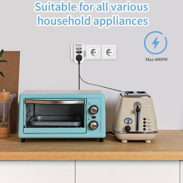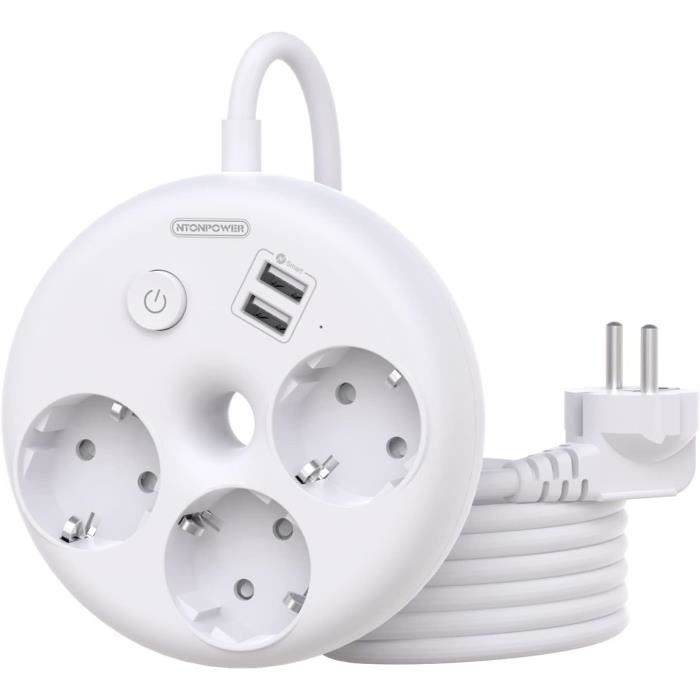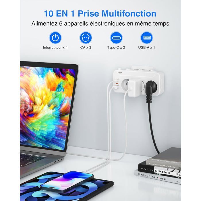 SPORWAY Multiprise Electrique USB 3 Prises: Prise USB Multiple avec 1 USB C & 3 USB, 7 en 1 Multiprise Murale Chargeur Electrique Adaptateur Prise pour Maison, Bureau - 16A/4000W Caractéristiques : ▶ La multiprise à 3 voies peut alimenter 7 appareils en même temps. 7 en 1 ultiprise urale, ultiprise avec 3 Prises Française, Prise ultiprise Electrique USB 4 Prises avec 3 USB-A NTONPOWER 2500W Prise... Aucune installation requise, plug and play, parfait pour charger vos appareils en voyage ou en vacances. Spécification : Nom : Multiprise Electrique USB 3 Prises Matériau : ABS/PC/cuivre Couleur blanc Dimensions : 15,5 x 10 x 4 cm Poids : 300 g Puissance : 16A/4000W (MAX) USB-C 17 W (MAX) USB-A 12 W (MAX) Puissance USB totale : 17 W (MAX) Tension : 220 ~ 250 V, 50/60 Hz Contenu de la livraison : 1 x Multiprise Electrique USB 3 Prises ▶ La multiprise à 3 voies est dotée d'une protection contre les surtensions et les surintensités. ▶Le câble de 0,5 m de long peut pivoter librement à 360°, ce qui le rend plus confortable à utiliser. Remarque : La capacité de charge maximale du câble est de 5 kg. ▶ Aucune installation requise, il suffit de brancher et de jouer. Puissance jusqu'à 4000 W (max., 250 V, 16 A). Pulchra Prise de table 3/2 prises horizontales ultiprise avec 2 ports... Double Prise Oraio Prise USB Ultiple, Ultiprise Urale Cube 3 Prises Avec 3 QC 3 Prise Multiple Avec Interrupteur Utilisation sûre: La multiprise est équipée d'une fiche de contact de protection et d'un couplage de contact de protection pour éviter la saleté et la poussière.