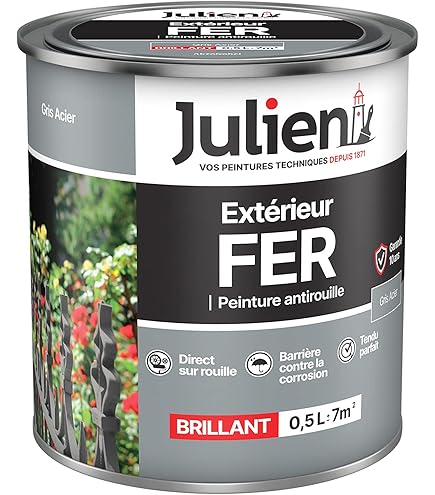 Peinture Mur Exterieur Peintures Pour Murs - 5107958 Peinture Gris Bleuté Peinture Antirouille Gris Anthracite Il résiste contre les agressions climatiques même extrêmes. - Application conseillé à la brosse pour assurer une « épaisseur » en rapport avec la protection désirée. La peinture Multi-Mat riaux Direct Protect Satin s'applique directement sur tous les supports, neufs ou anciens.R sistante aux chocs, taches, intemp ries, elle est garantie 7 ans. Ses 20 teintes satin es s'adaptent toutes les envies, et tous les styles. S chage en 1 heure. Recouvrable en 6 heures Julien Peinture aérosol JULIEN Color Touch - Bleu gris - 400 ml pas... Recouvrement garanti avec la plupart des peintures de finition classiques (acrylique ou glycérophtalique) , Application facile ANTIROUILLE (PEINTURE A EAU) ANTICORROSION JULIEN 20KG REF(7012) GRIS Peut couvrir 7 m² en 1 couche ou 3 m² en 2 couches Protection antirouille longue durée , Excellent accrochage - Dans le cas d’une application au pistolet, diluer de 10 à 15% de diluant universel ou white spirit. Peinture aérosol JULIEN Color Touch - Bleu gris - 400 ml, une peinture sans sous couche idéale pour relooker tous vos meubles ou objets. Caractéristiques : - Protection antirouille longue durée - Excellente accrochage - Recouvrement garanti avec la plupart des peintures de finition classiques (acrylique ou glycérophtalique) - Application facile - Aspect gris neutre, facilement recouvrable - Le film déposé suit les mouvements du métal - Excellente tenue extérieure à 1 couche - Peinture intérieure et extérieure - Gris mat - Temps de séchage : 6h - Couverture ≈ 14 m²/L - Support : métaux ferreux Conseils d’utilisation : - Nettoyage : white spirit - Produit prêt à l’emploi.