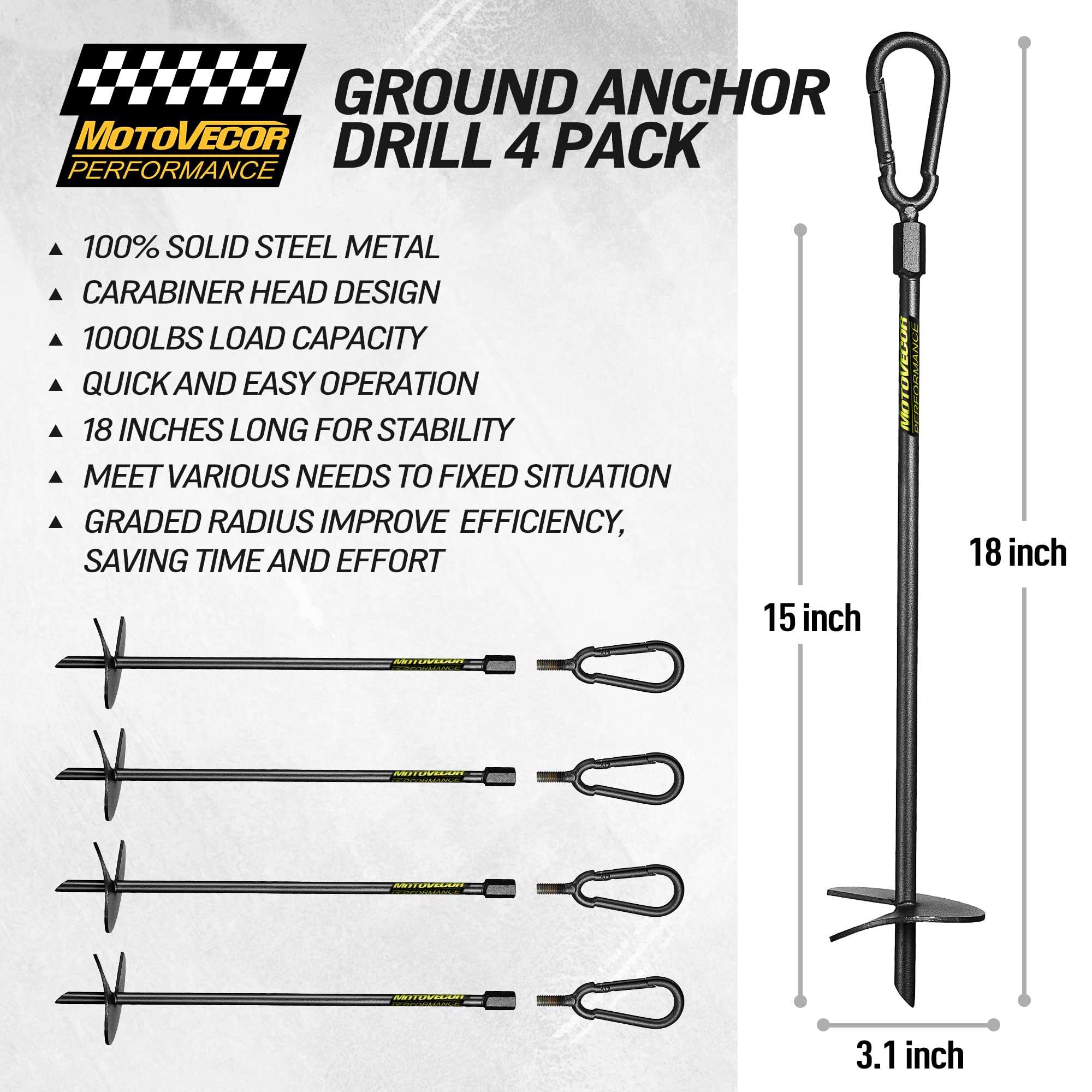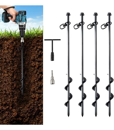 Quantité : 4 piquets Diamètre de la spirale : 7,5 cm. Application : convient pour différents types de sol, y compris le sol, le sable et la pelouse. Stabilité améliorée : les lames en spirale de 7,5 cm pénètrent profondément dans le sol, offrant une forte adhérence dans divers sols. Ensemble complet : comprend 4 chevilles robustes, une clé à poignée en T et un tourne-écrou. Longueur : 45,7 cm. Enclos pour animaux : ces ancrages au sol sont assez solides pour sécuriser les maisons mobiles pour animaux de compagnie, assurant que vos animaux restent en sécurité même dans des conditions venteuses. Lot de 4 piquets de trampoline de 45,7 cm – Kit d'ancrages résistants au vent fort du vent – Ancrages au sol à visser – Ancrage de terre avec sangles d'arrimage... Sécurisez vos ancrages au sol en quelques secondes, ce qui permet d'économiser du temps et des efforts, que ce soit pour un usage professionnel ou quotidien Maison et jardin : parfaits pour ancrer des abris de jardin, des abris de voiture ou des structures de jardin, ces piquets offrent une tranquillité d'esprit en gardant vos investissements extérieurs en sécurité. Événements en plein air : utilisez ces piquets pour sécuriser les bâches, les tentes et les auvents lors d'événements ou de foires en plein air, en veillant à ce que tout reste en place malgré les intempéries. L'insertion facile dans le sol, le sable ou l'herbe améliore la stabilité de la structure SELEWARE Lot de 4 ancrages au sol à visser de 43,2 cm, kit d'ancrage Ancrage Balancoire Exterieur AceFly Lot De 4 Ancrages Au Sol Robustes à Visser De 45,7 Cm Ancrage Sol Scénarios d'utilisation : camping : parfait pour sécuriser votre tente ou auvent sur un terrain sablonneux ou rocheux, assurant la stabilité tout au long de vos aventures en plein air.