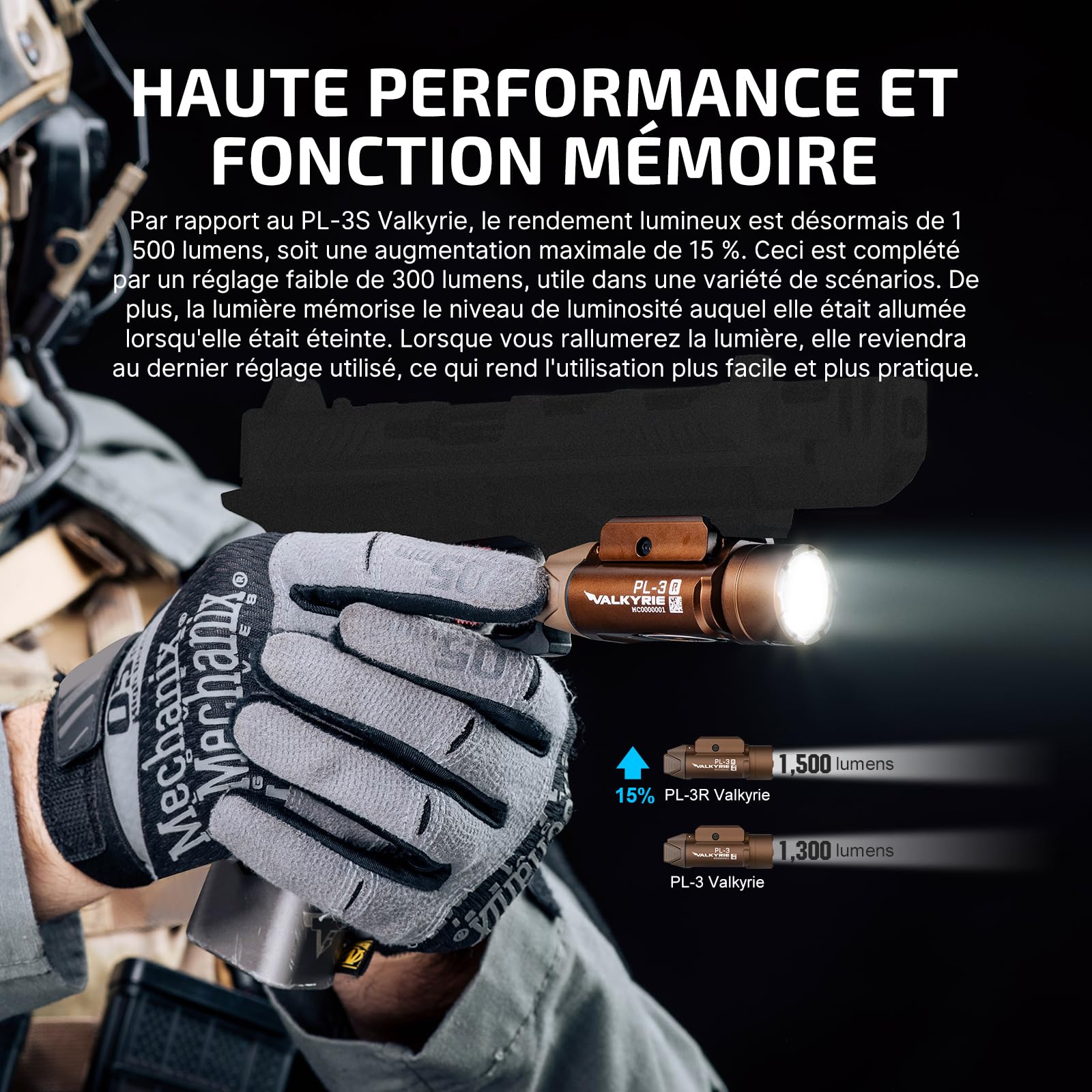 Description du produit OLIGHT Lampe de Poche Militaire 1500 Lumens 205 Mètres Elle permet également un montage et un démontage faciles d'une seule main. 【𝐏𝐞𝐫𝐟𝐨𝐫𝐦𝐚𝐧𝐜𝐞 é𝐧𝐨𝐫𝐦𝐞】 Max 1500 lumens en mode élevé, avec une portée maximale de 205 mètres, et un mode faible de 200 lumens en cas de besoin en intérieur Lampe Pl 3r Valkyrie Olight PL-3R Valkyrie Lampe Tactique 1500 Lumens - Lasers, Pointeurs Et Lampe Torche Led Ultra Puissante PL-3R Valkyrie est une lampe tactique aus rails picatinny, alimentée par une batterie rechargeable de 900mAh, puissance max. Lampe tactique 1500 lumens rechargeable par USB avec attache rail... 1 Plus de Puissances 2 Deux couleurs 3 Deux modes Différences entre la nouvelle lampe tactique LED Olight PL TURBO et les lampes de la série PL anded easy assembly and disassembly 【𝐁𝐥𝐨𝐜𝐚𝐠𝐞 𝐝𝐞 𝐜𝐥é 𝐚𝐣𝐮𝐬𝐭𝐚𝐛𝐥𝐞】Montage sur rail avec un bloc de clés réglable pour s'adapter à une variété de structures de rail 【𝐂𝐨𝐦𝐦𝐮𝐭𝐚𝐭𝐞𝐮𝐫𝐬 𝐚𝐦𝐛𝐢𝐝𝐞𝐱𝐭𝐫𝐞𝐬】 Commutateur de réglage à double mode pour répondre aux différents scénarios de tout utilisateur.