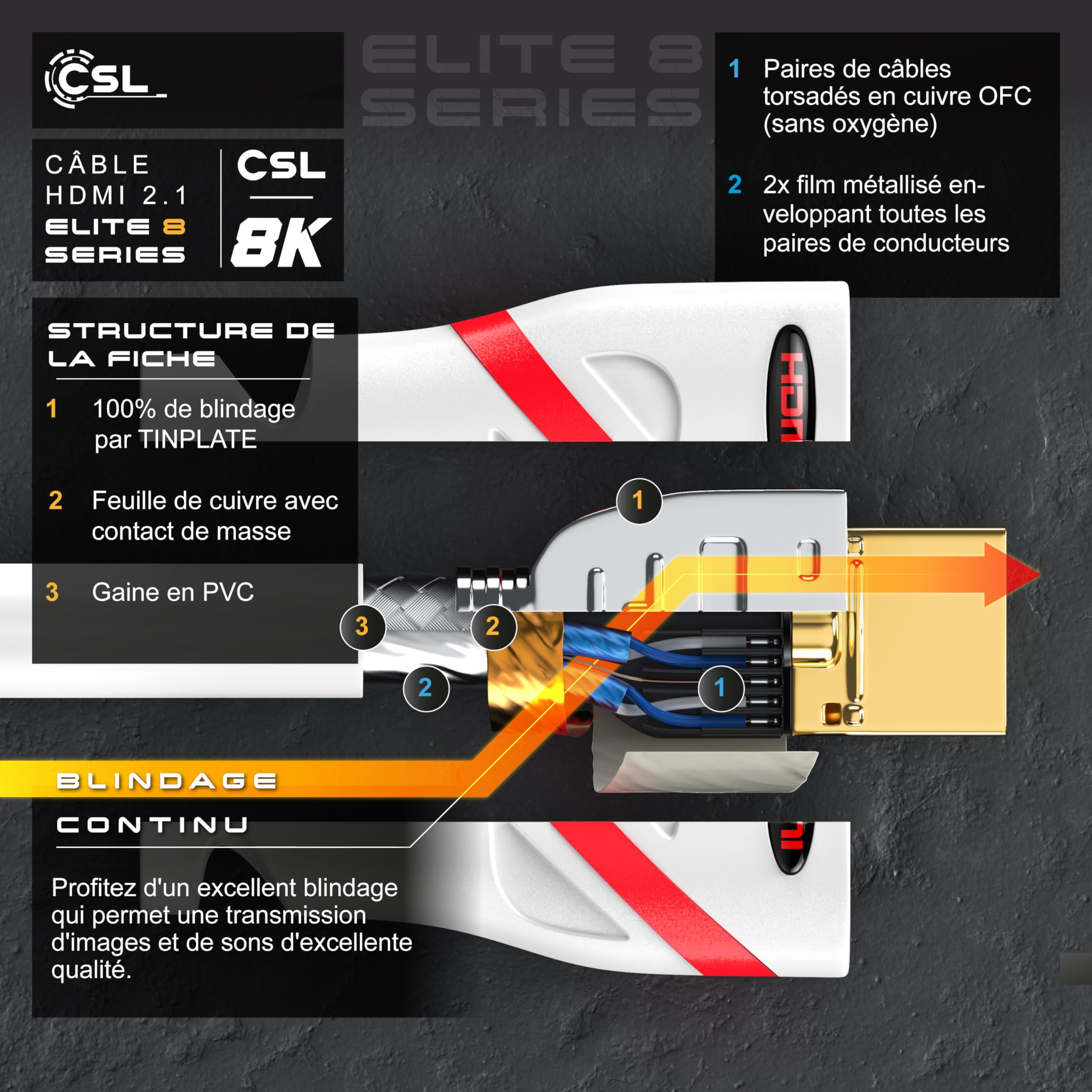Profitez de vidéos HD et de signaux audio numériques de la plus haute qualité ! Le câble HDMI à l'épreuve du temps transmet des images en excellente résolution : jusqu'à 7680 x 4320 @ 120 Hz (avec DSC) et 7680 x 4320 @ 30 Hz (sans DSC). Bande passante jusqu'à 48 Gbit/s & supporte 16 bpc ou 48 bits par pixel En 4k, il offre la plus haute résolution avec des taux de rafraîchissement rapides comme l'éclair (en fonction de la carte graphique et du moniteur) : 3840 x 2160 @ 120 Hz. Cable Hdmi 4k Câble HDMI 2.1 Ultra Mince 8K - 4K@120Hz, 8K@60Hz, 48 Gbps - Compatible PS5, TV 4K, Blu-ray Cable Hdmi 2.1 3m Le câble CSL Premium 8k UHD II HDMI est compatible avec la 3D et supporte toutes les résolutions à partir de 8K ainsi que le format cinéma 21:9 et jusqu'à 32 canaux audio. 1 RÉSOLUTION 2 GAMING & OFFICE 3 ENTERTAINMENT Compatible avec les versions antérieures. 1 CABLE PREMIUM 2 BLINDAGE 3 3x PROTÉGÉ Parfait pour tous les appareils HDMI comme les téléviseurs 4K et 8k, PlayStation 4 et 5, Xbox One X et S, Xbox Series X et S, lecteurs Blu-ray 4k Color + Deep Color jusqu'à une profondeur de couleur de 48 bits. A scalable solution for 8k gaming. In 4k, it offers the highest resolution with lightning-fast refresh rates (depending on the graphics card and monitor Des contacts plaqués or parfaitement ajustés garantissent une transmission du signal à faible perte. Hdmi 10m CSL - Câble HDMI 8k / 4k 2.1/2.0 10m - 8K @ 60Hz - 4K @ 120Hz Cable Hdmi 2.1 La bande passante peut atteindre 48 Gbit/s. Parfait pour tous les appareils HDMI tels que les téléviseurs 4K et 8k, la PlayStation 4 Pro, la Playstation PS5, la... Support 8K jusqu'à 120 Hz avec DSC | Fiches de précision avec blindage complet. Caractéristiques : Câble HDMI à l'épreuve du temps selon le standard Ultra High Speed, offre HDR, ARC, 3D, espace colorimétrique 10bit, YcbCr 4:4:4, Highspeed Ethernet Le triple blindage garantit une excellente protection contre les signaux parasites extérieurs. Transmet tous les formats audio numériques tels que 2., 0, 2., 1, 5., 1, 7., 1, DTS-HD Master Audio, Dolby TrueHD, Dolby Digital, DTS, etc., 8k: 7680 x 4320 @ 120 Hz, 5k: 5120 × 2880 @ 120 Hz, 4k: 3840 x 2160 @ 240 Hz