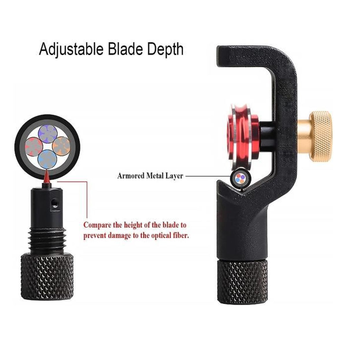 Cette pince KELUSHI à trois trous permet de dénuder proprement les câbles : premier trou pour la gaine 2-3mm, deuxième pour le tampon 600-900um, troisième pour... --- Fentes ondulées en cuivre, acier ou aluminium couche de blindage pour l'alimentation en fibre, tube central et autres câbles blindés. --- Utilisez un échantillon de câble comme guide pour définir la profondeur de la lame. Fournisseurs et fabricants d'outils de dénudage de fibre optique FTTH 8-28mm Dépouilleur De Câble En Fibre Optique Blindé FTTH --- Construction robuste en aluminium anodisé et en acier --- La molette de guidage pour les câbles de plus petite taille peut être commandée séparément. Volume du produit : 4-10 (rouge) et 8-28,6 (doré) : 1 8–28,6 (doré) Conseils : Afin d'améliorer le produit, nous continuerons à mettre à jour et à mettre à niveau la partie du produit sans modifier les fonctions principales du produit et l'apparence du corps principal. --- La lame en acier au carbone trempé fixe en usine ne nécessite aucun réglage de la lame régulier., Poids du produit : 1., 4-10 (rouge) : 309 g., 2., 8-28,6 (doré) : 300 g., 3., 8–28,6 (doré) Double tête : 451 g. Caractéristiques : --- La molette de guidage de câble fournit la stabilité du câble et permet un déplacement plus facile de l'outil le long du câble. La vis à fente inférieure dispose de 10 graduations qui ajustent la hauteur de la lame lorsqu'elle est tournée. Deux méthodes de coupe : cette pince à dénuder blindée peut faire pivoter la lame de 90 degrés en actionnant la tige de la lame, ce qui facilite la coupe... Pour câble micro à mi-envergure ou fente de fin de tube lâche 1., Déterminez la construction du câble., Réglage de la lame.