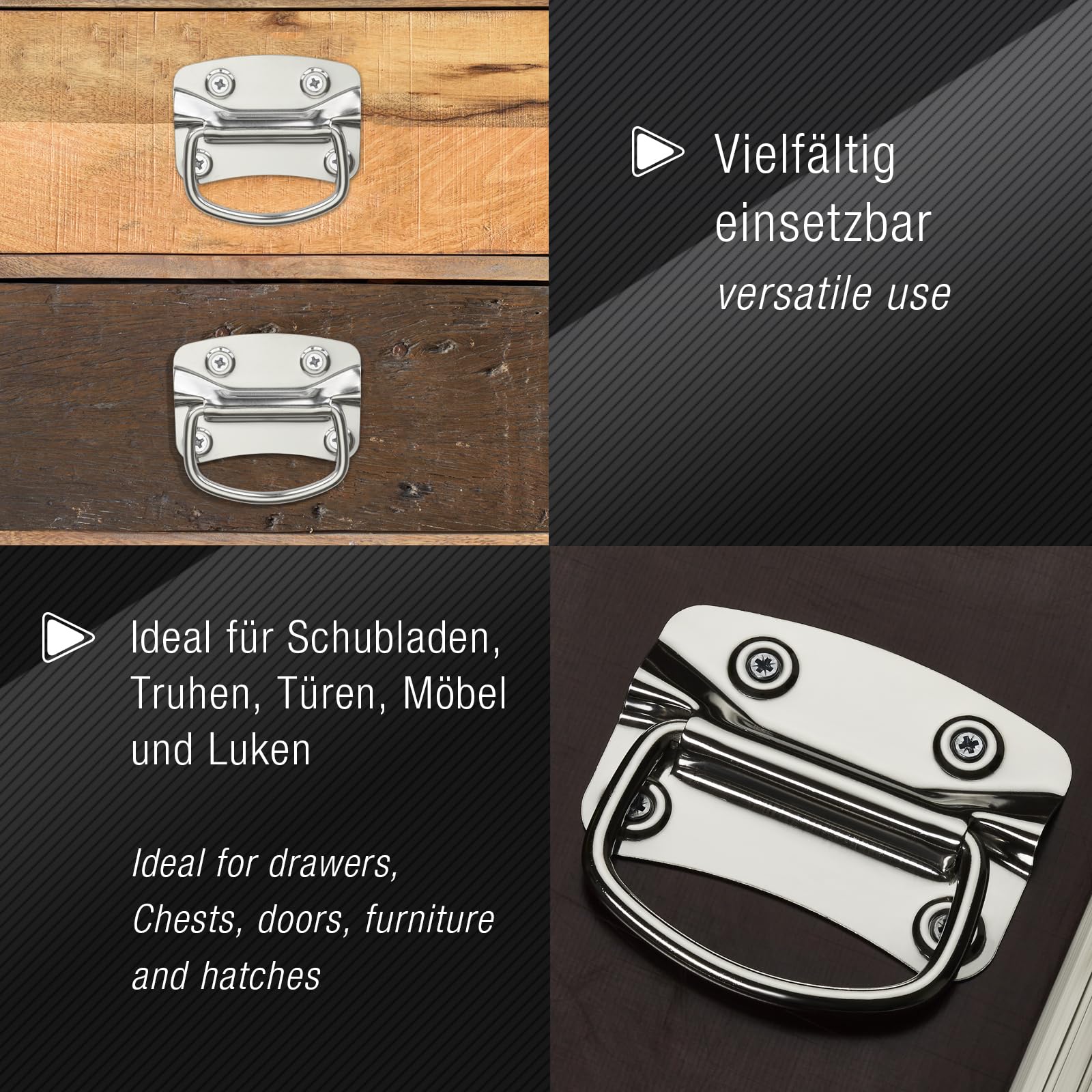 Luken : Que ce soit dans un bateau, un camping-car ou une cave, les poignées offrent un moyen stable d'ouvrir et de fermer les trappes en toute sécurité. Boîtes à outils : Idéales pour les solutions d'atelier mobiles, car les poignées permettent un déplacement et un transport rapides. La surface galvanisée jaune apporte simultanément un accent technique marquant. Choisissez la barre porte-fiches à Billes de Comas pour une solution efficace qui soutient la productivité et améliore l'organisation de vos services culinaires.Marque : COMASPoids : 1.20 kg La version galvanisée à l'argent offre une protection durable contre la corrosion et une esthétique sobre et technique pour des applications polyvalentes. Avec les poignées de caisse SOTECH en acier de haute qualité, la manipulation des caisses, coffres et meubles devient un jeu d'enfant. Différentes possibilités d'utilisation de la poignée de meuble Particularité de la poignée de meuble Le mécanisme de pliage de la poignée de caisse SOTECH est une construction intelligente qui allie fonctionnalité et gain de place. SOTECH 1 paire Poignées de caisse (100 x 70 mm, acier inoxydable,SS201, noir) Poignée de tiroir rabattable à visser, vis de fixation incluses : : BricolageAvec les poignées de caisse SOTECH en acier de haute qualité, la manipulation des caisses, coffres et meubles devient un jeu d'enfant. Les poignées rabattables convainquent par leur conception robuste et permettent un... Meubles : Les meubles rustiques comme les coffres, les commodes ou les buffets gagnent non seulement en fonctionnalité grâce aux poignées, mais aussi en look industriel. La version noire est élégante et discrète – parfaite pour les meubles modernes et les concepts de design contrastés. Tiroirs : Surtout pour les tiroirs grands ou lourds, les poignées offrent une prise stable et améliorent l'ergonomie. Stands d'exposition : Les meubles mobiles ou les boîtes de transport pour les montages d'exposition bénéficient d'une manipulation rapide grâce aux poignées. Installation polyvalente : Peut être fixé facilement au mur par vissage ou collage, permettant une adaptation parfaite à tout type de cuisine. / Domaine d'utilisation : convient pour les caisses, les coffres, les tiroirs, les portes, les portails coulissants, les meubles et les trappes. ✅ Contenu de la livraison : 1 paire (2 pièces) de poignées de caisse, matériel de fixation inclus La poignée est reliée à la plaque de montage et permet de la rabattre vers le bas ou vers le haut, selon qu'elle est utilisée ou non. Poignée De Caisse 4 Pièces Vis De Réglage 8 X 30 58 Acier Inoxydable Véritable Poignée Caisse Leroy Merlin La version en acier inoxydable noir combine un look moderne avec une qualité robuste – idéale pour les designs industriels élégants. ✅ Montage : les poignées de caisse sont livrées avec des vis de fixation de couleur assortie. Le nickelage argenté offre une surface lisse et brillante avec une protection supplémentaire contre l'usure. Grâce aux trous de perçage préfabriqués et au matériel de fixation fourni, le montage est rapide et simple. M-120 | Poignée coulissante 1 - Cliquet, douilles et accessoires