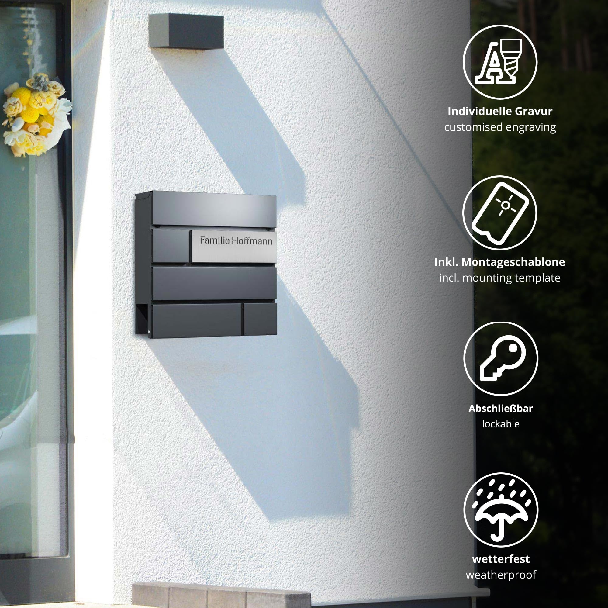 La boîte aux lettres anthracite avec compartiment à journaux combine un design moderne, une fonctionnalité et une touche personnelle. DESIGN MODERNE : la boîte aux lettres anthracite RAL7016 convainc par un motif de carrelage élégant qui complète avec élégance chaque entrée de maison et donne une esthétique intemporelle Ce détail personnalisé fait de la boîte aux lettres un point fort unique. Boîte aux Lettres Murale - 37,5 x 10 x 39 cm - avec Compartiment à Boîte aux lettres murale avec porte-journaux en dessous, convient pour les journaux enroulés, les catalogues, les brochures, etc. Boîte aux lettres verrouillable en acier au carbone, en anthracite/argent avec un motif stylé et élégant, un complément frappant pour chaque entrée de maison Dimensions de la boîte aux lettres env. 37x37x11... Forgard TRELLEBORG Boîte Aux Lettres Blanche Avec Compartiment à L'élégant motif de carreaux donne à votre entrée de maison un aspect élégant, tandis que les noms de rue et le numéro de maison sont gravés individuellement sur deux plaques argentées. Montage facile : le matériel de fixation et une plaque « Pas de publicité » sont inclus pour que vous puissiez monter la boîte aux lettres rapidement et facilement Verrouillable et sûr : la boîte aux lettres murale est équipée d'une serrure robuste et de deux clés pour garder votre courrier en toute sécurité contre tout accès non autorisé Avec un compartiment à journaux intégré, les journaux et les magazines restent bien rangés. Compartiment à journaux intégré : le compartiment à journaux pratique offre de la place pour les magazines et les journaux et garantit que votre courrier reste toujours propre et sec
